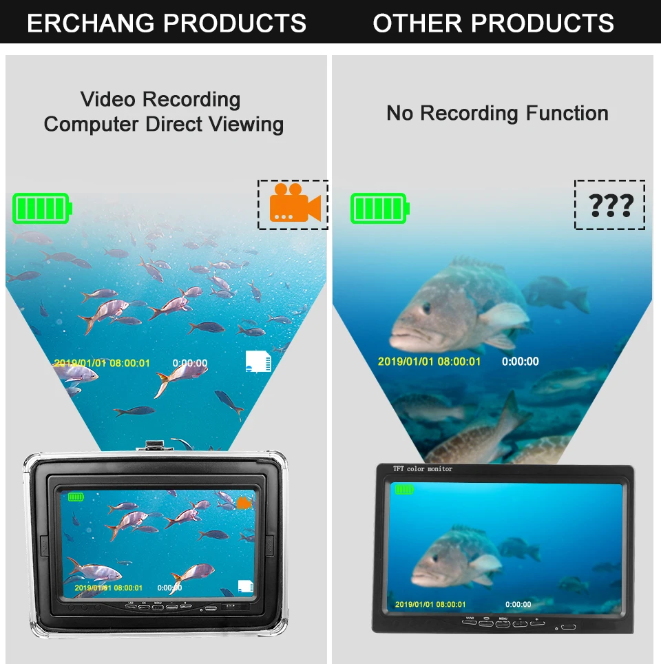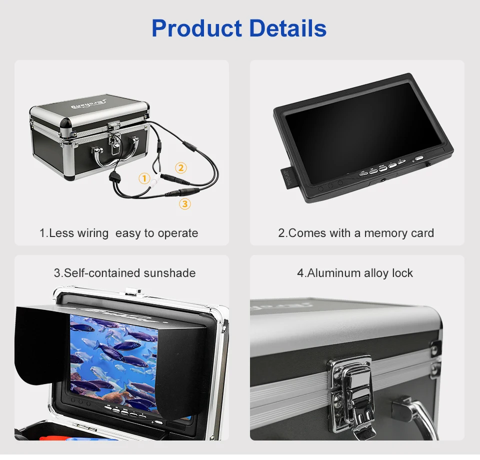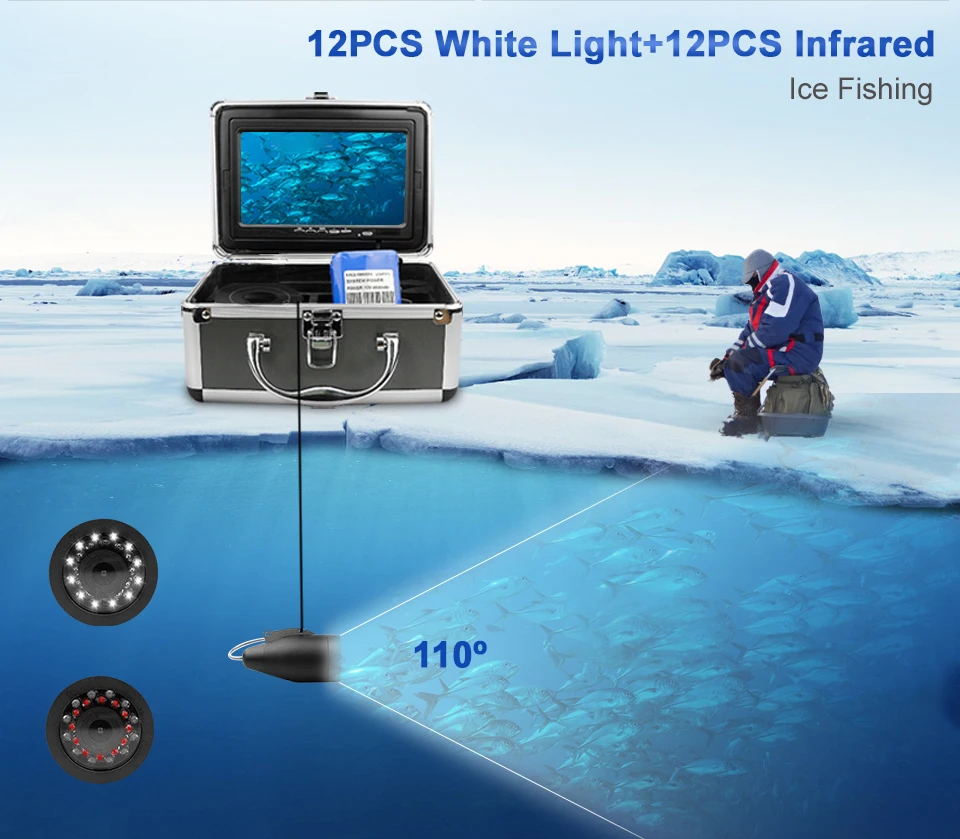 Описание рыболовной камеры:Этот продукт, который вы смотрите сейчас, является последней популярной, модной, красивой и удобной подводной системой видеокамеры. Он не только имеет большой и цветной экран, но также имеет камеру с разрешением высоты, которая имеет HD 1000 телевизионных линий. 12 шт. белых светодиодов, 12 шт. инфракрасных ламп, high-intensity.4 состояние светодиодов: белый светодиод, ИК-светодиод, все светодиоды также можно регулировать яркость светодиодов, чтобы получить более качественное изображение Область применения: мониторинг аквакультуры, подводные исследования, океан/лед/Озеро Рыбалка плавание/дайвинг/Подводное плавание доступны.Особенности:1,7 дюймов 1280*720 цветной монитор с солнцезащитным козырьком для яркой окружающей среды снаружи2. Четкие изображения с HD 1000TVL мегапиксельной рыбацкой камерой.3. Водонепроницаемый, алюминиевый сплав 110 градусов дизайн рыбы4. Холодостойкие, водонепроницаемые и тянущиеся кабели5. Доступный удлинитель камеры длина кабеля: 15 м6. 12 белых светодиодов, 12 инфракрасных ламп, высокая интенсивность.7. Время непрерывного использования аккумулятора составляет до 8 часов, состояние батареи.8. Мы положим изделия в 4 разных светодиодный Статус: Белый светодиодный на 、 ИК светодиодный на 、 все Светодиодный off, также можно настроить светодиодный яркость для того, чтобы получить более лучшее качество изображенияДисплейРазмер дисплея: 7 дюймовРазрешение дисплея: 1280*720Входное напряжение монитора: 12 В постоянного токаКамера:Датчик изображения: датчик CMOSIP68 водонепроницаемыйУгол обзора: 110 градусовВидимое расстояние (чистая вода): 1-3 мНочное видение: 12 белых светодиодов и 12 инфракрасных ламп.Камера: 1000TVL/алюминиевый сплавАккумулятор: 4500AHПродолжительное время использования аккумулятора: около 8 часов