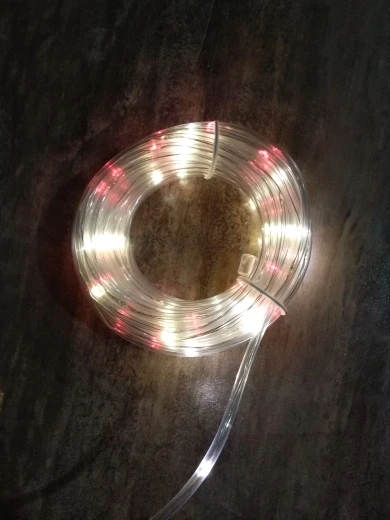Упакован в коробку. Трубка очень тонкая, 5-6мм. Яркость отличается по длине, на 10метрах уже видно что дальний конец от блока питания светится с меньшей яркостью, видимо беда с блоком питания или провода внутри слабые. В общем, слабая пародия на дюралайт.