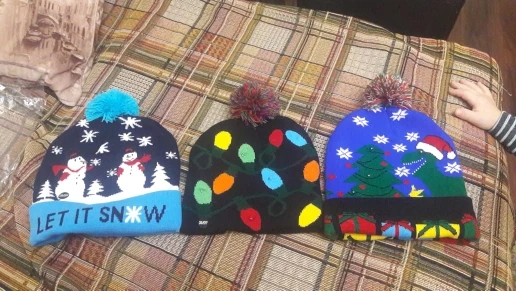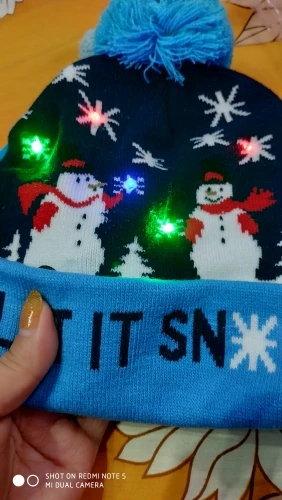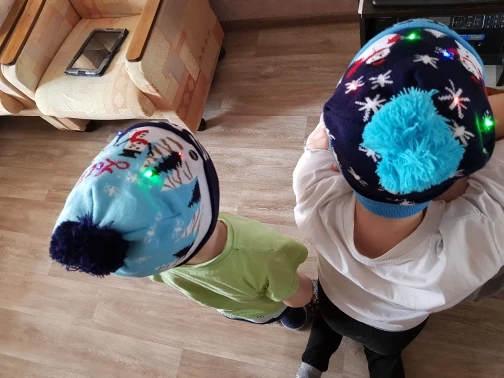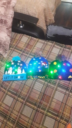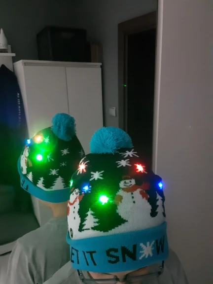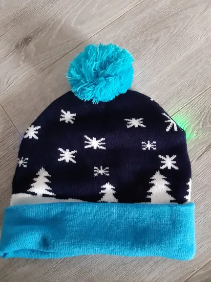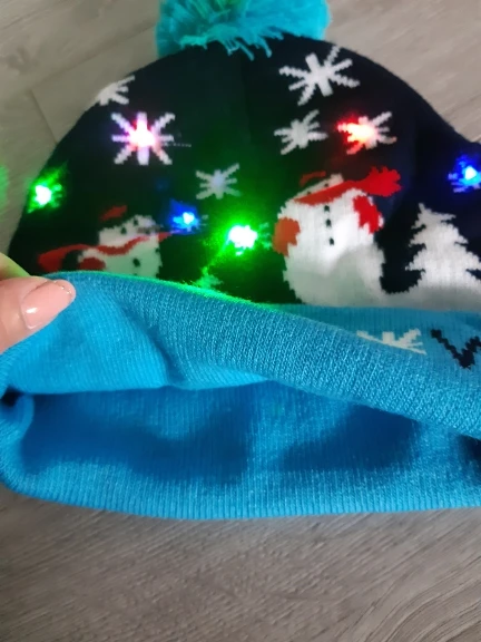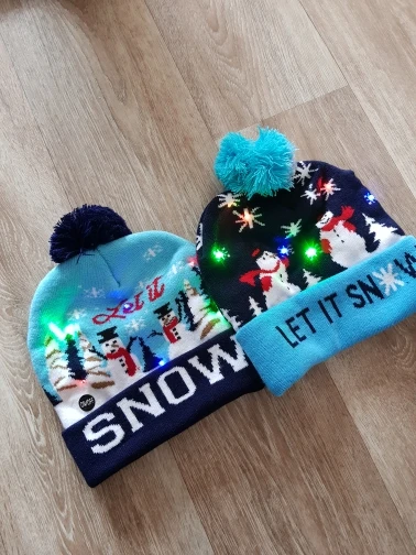 Шапочки красивые, все светятся. Выполнены качественно. Жаль, что не пришли до праздников, малышне поиграть. Они конечно одноразовые до первой стирки. Зелёная и со снеговиками, они с отворотом и больше по размеру, сверкают разным цветом. Со снежинками без отворота, горит белым цветом и меньше размером. Но все по-своему красивые и стоят этих денег. А мне и надо было на разный возраст детей.