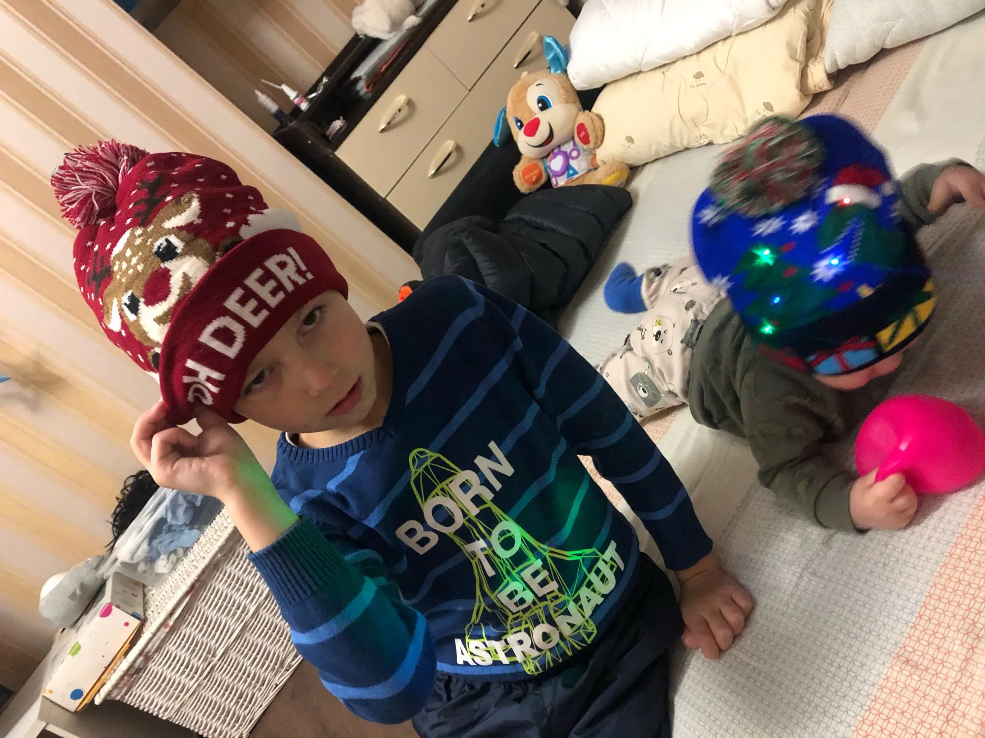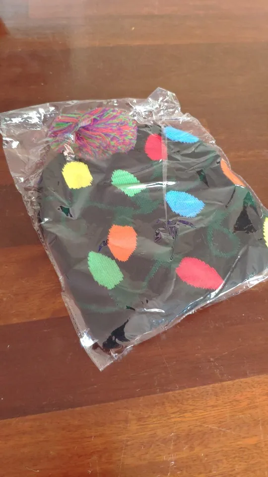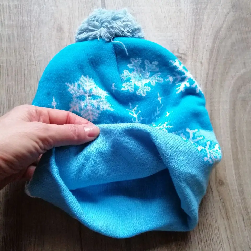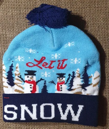 Шапка ехала в Россию в Санкт-Петербург 3 месяца. Это неожиданно. С середины ноября до середины февраля. Ну, на следующий новый год уже будет задел :))). Шапки бесшовные по кругу, двойные, тонкие, приятные тактильно. Не на морозы, конечно. И без утепления. На взрослую большуб голову и на 7лет нормально. Они хорошо тянутся. На маленькую голову и малюток можно брать только голубую шапку со снежинками и белой подсветкой и черную с принтом овальных разноцветных лампочек. Они поменьше и без отворота.