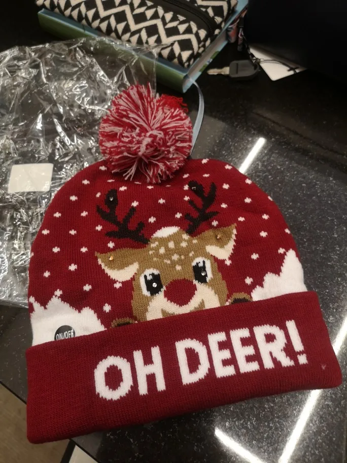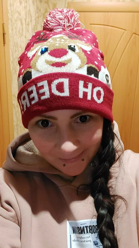 шапка красивая, классная!!! плотная, двойная, огоньки сверкают в глазах , ушках и рожках!!! очень нравится!!!