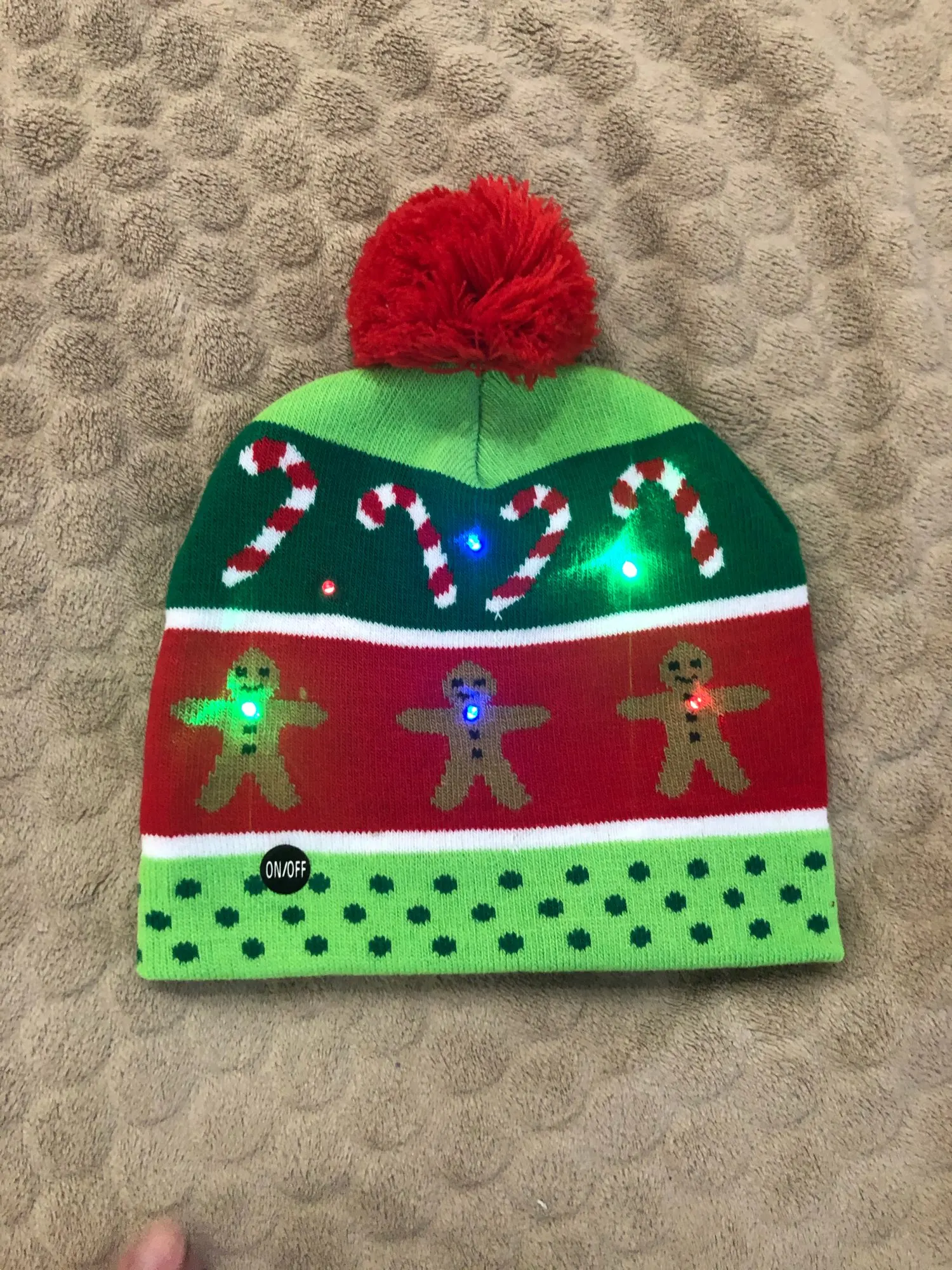 Товар соответствует фото, качество отличное, мягкая, тёплая, рисунок чёткий, лампочки горят, на детскую голову великовата. Дошло до Смоленска за 3недели, трек отслеживался, рекомендую, спасибо.