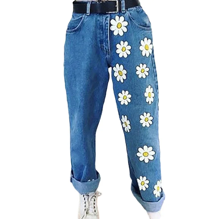 Женские джинсы прямые, с высокой талией, длинные брюки из денима с винтажным принтом маргариток, уличная одежда, 2021