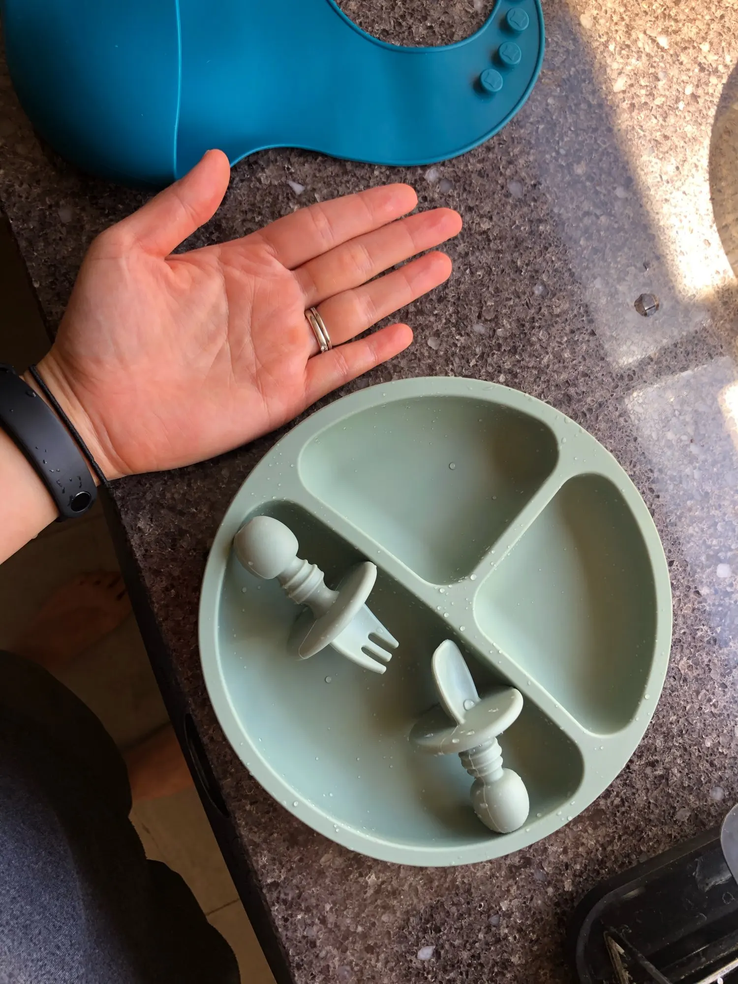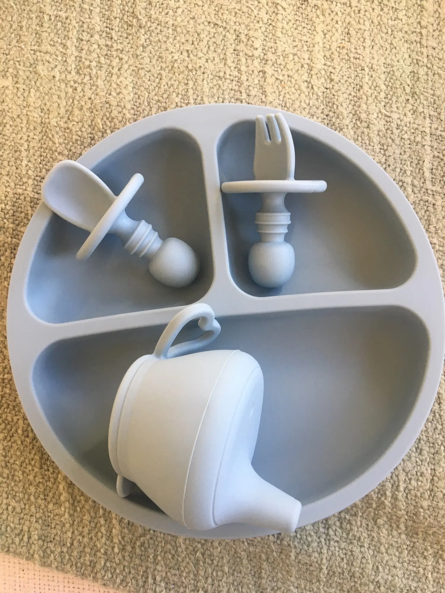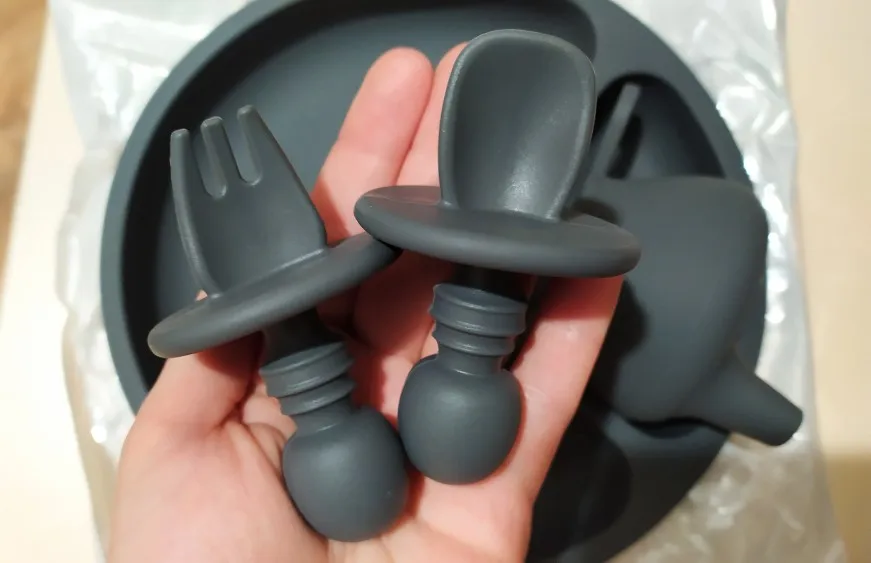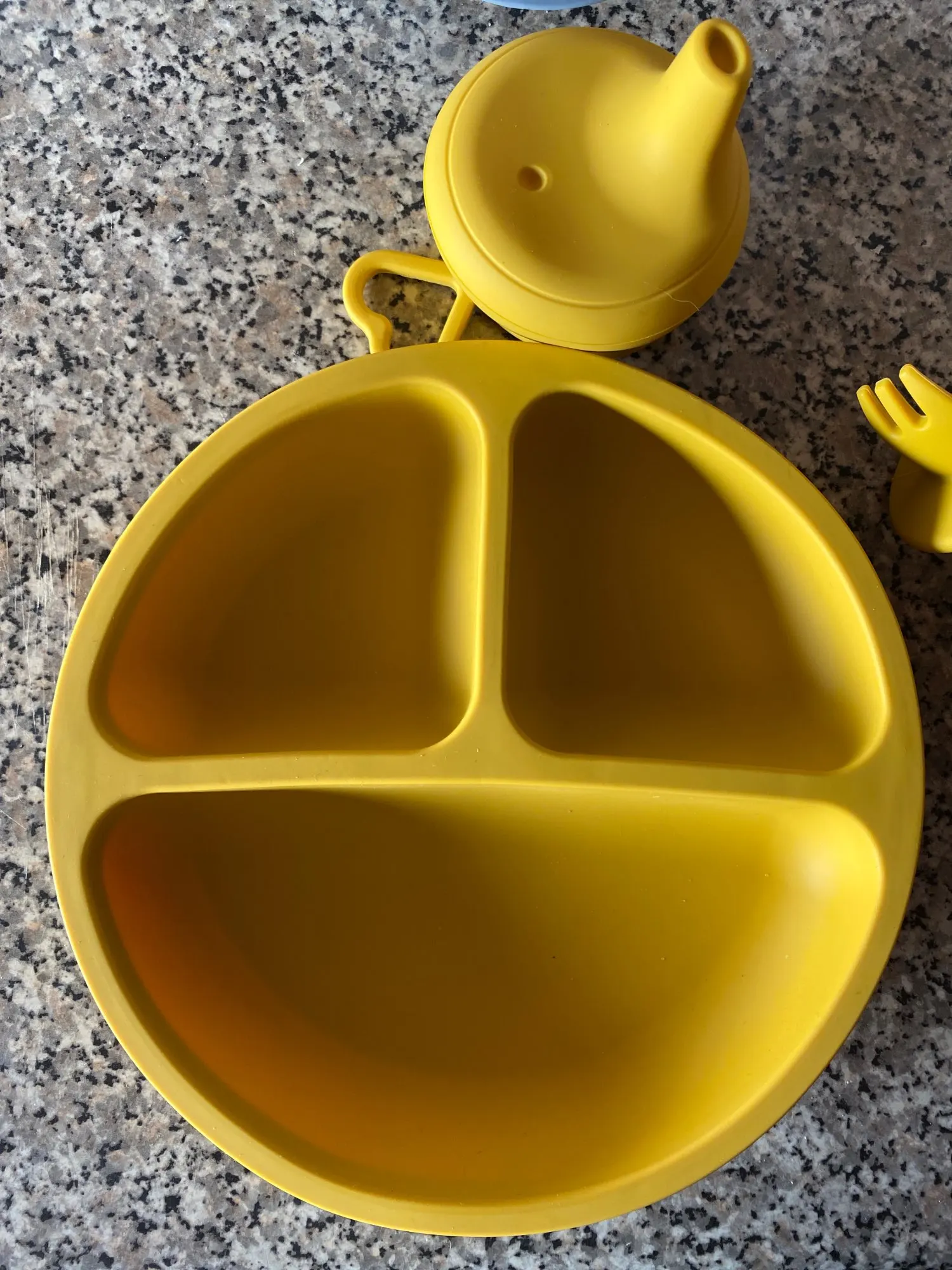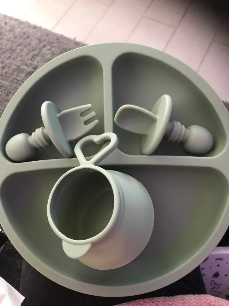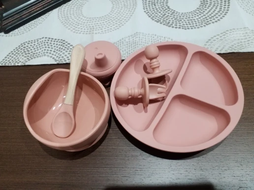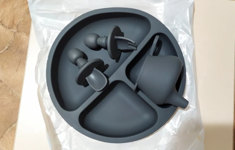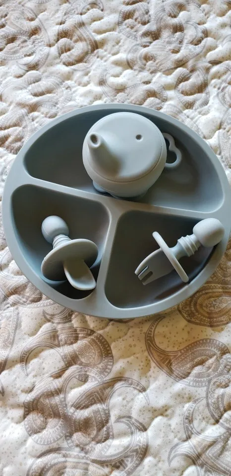 Качество посуды отличное, ничем не пахнет, сразу начали пользоваться. Малышке нравится кушать из разных частей тарелки. Стаканчик не понравился, но это дело времени, думаю.