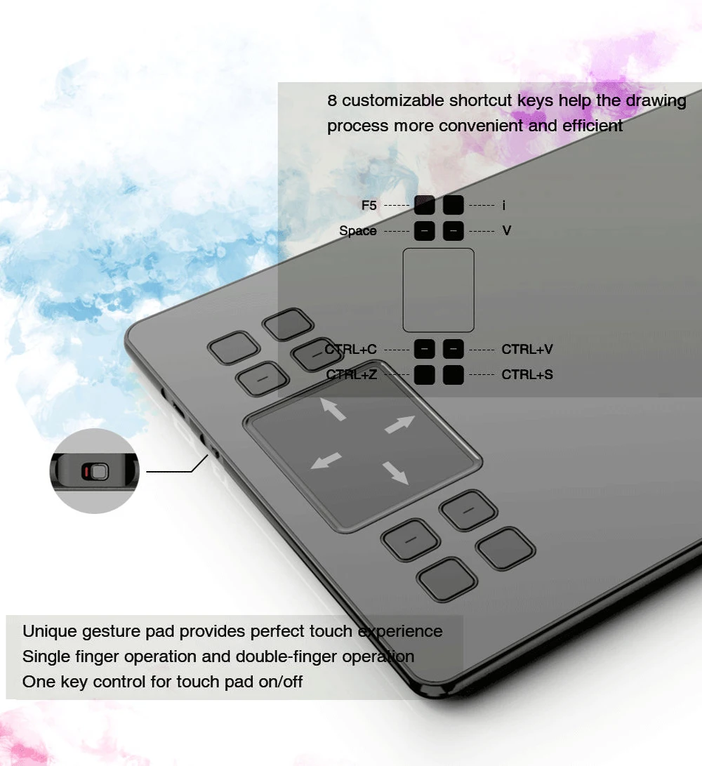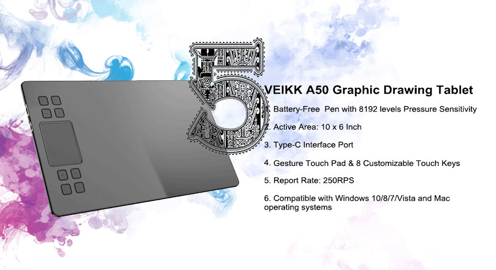 Размер продукта: 358 мм (Д) х 200 мм (Ш) х 9 мм (В)Активная область: 10x6 дюймовРучка: пассивная ручка без аккумулятораДавление ручки: 8192 уровнейСкорость передачи данных: 250pps (точек/секунд)Высота чтения: 10 мм