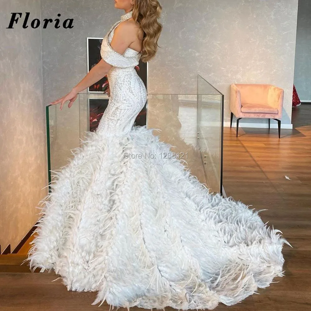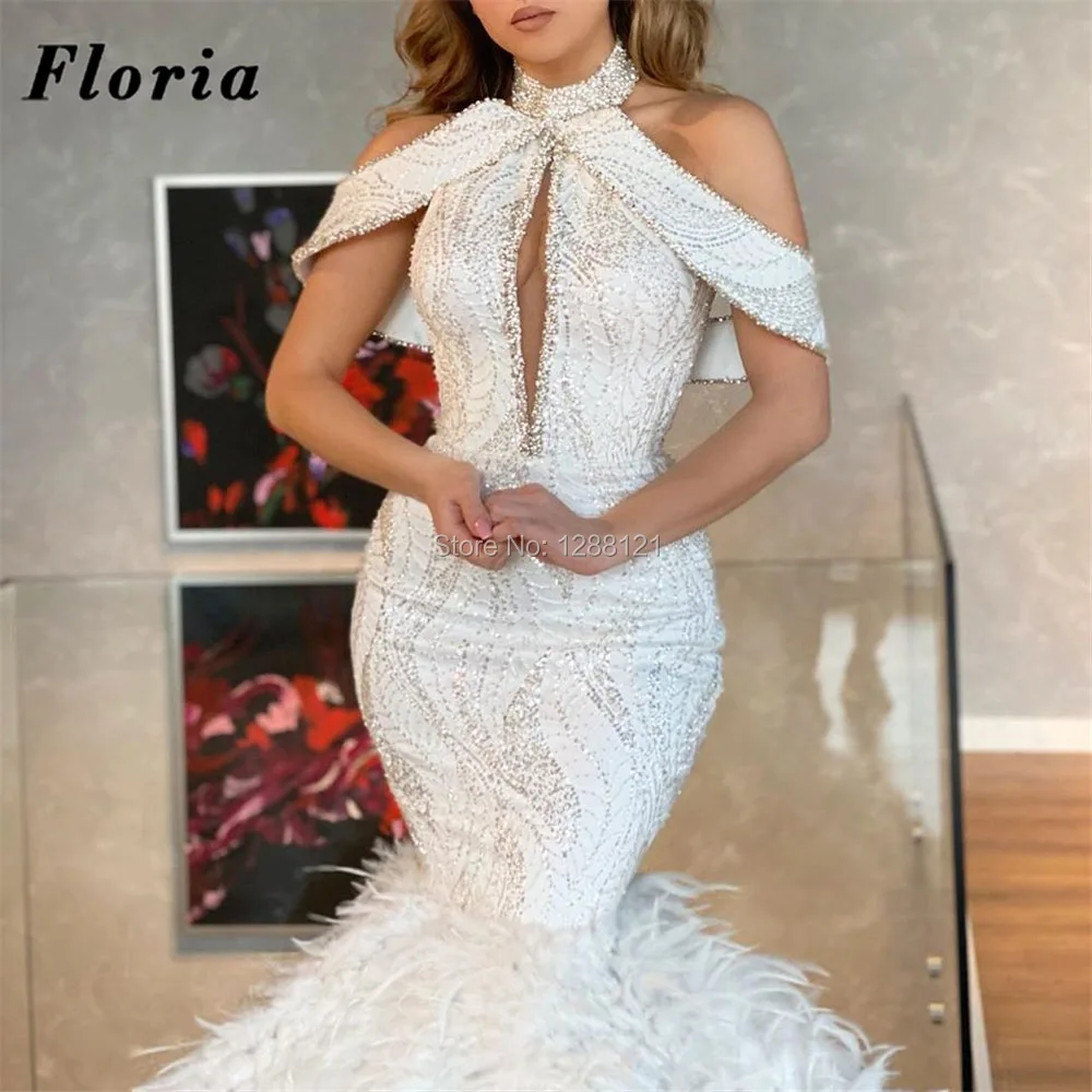 Новое поступление свадебных платьев с перьями 2021 Дубай Русалка с бисером с лямкой на шее платье для невесты арабское платье