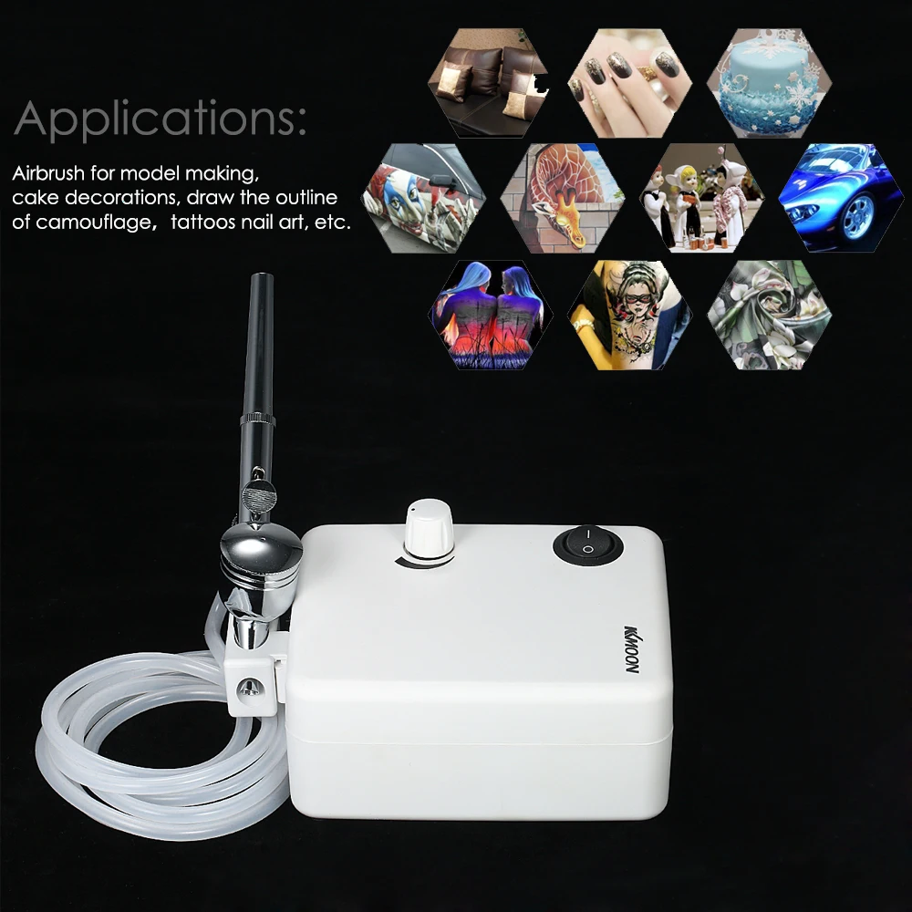 Нужен мини-компрессор с использованием специальной конструкции без масла? Попробуйте этот! Это не масляная конструкция делает среднюю передачу не загрязненной. Выходная жидкость устойчива и диапазон давления от 25 до 30 фунтов на квадратный дюйм. Этот профессиональный комплект воздушного компрессора airbrush широко используется в производстве моделей, украшении тортов, татуировках, Нейл-Арте и т. д. Идеально подходит для художественных работ, красоты ногтей, боди-арта, дизайнерской живописи, модельной живописи, украшения тортов, ремесел, моделей и изобразительного искусства, таких как рисование автомобиля, красота и макияж.Особенности:Включает портативный воздушный компрессор, воздушный шланг, двойного действия гравитационный питательный Аэрограф, мини воздушный фильтр и держатель.Профессиональный набор Аэрограф Двойного действия с гравитационным питанием для хобби красок.Аэрограф для изготовления моделей, украшения тортов, нарисуйте контур камуфляжа, татуировки гвоздь и т. д.Довольно и премиум мини воздушный компрессор, портативный светильник, вес и легко носить с собой.Экономьте гораздо больше времени, чем Рисование ручной работы, и отлично подходит для вашего бизнеса с распылителем.Конструкция двойного пускового механизма экономит материалы и делает их прочными.Широко используется энтузиастами общей модели.Характеристики:Бренд: KKmoonЦвет: серебристый + белыйМатериал: алюминий + медь + резина + нейлон + пластикТип вилки: ЕС/США (Опционально)Вход: 100-250 В пер. тока, 50/60 Гц, 0.6A MaxВыход: 12V DC, 1.6AВыход воздуха в минуту: 8 л/минМаксимальное давление: 25-30psiДиаметр сопла: 0,3 ммЕмкость стакана жидкости: 7ccДиаметр шланга: 1/8"Силиконовый шланг Длина: 1,5 мРазмер воздушного компрессора: 120*95*65 мм/4,72*3,74 * 2.56inАэрограф Размеры: 14,7*2,8*8,5 см/5,8*1,1 * 3.3inВес изделия: 791 г/27,90 унций (набор)Посылка Размеры: 23,5*17*8,2 см/9,25*6,69 * 3.23inВес посылка: 865 г/30,53 унцийПосылка:1 * двойного действия 0,3 ММ Аэрограф1 * держатель для воздушной щетки1 * воздушный компрессор1 * Мини Воздушный Фильтр1 * воздушный шланг1 * трансформатор переменного тока1 * Руководство по эксплуатации