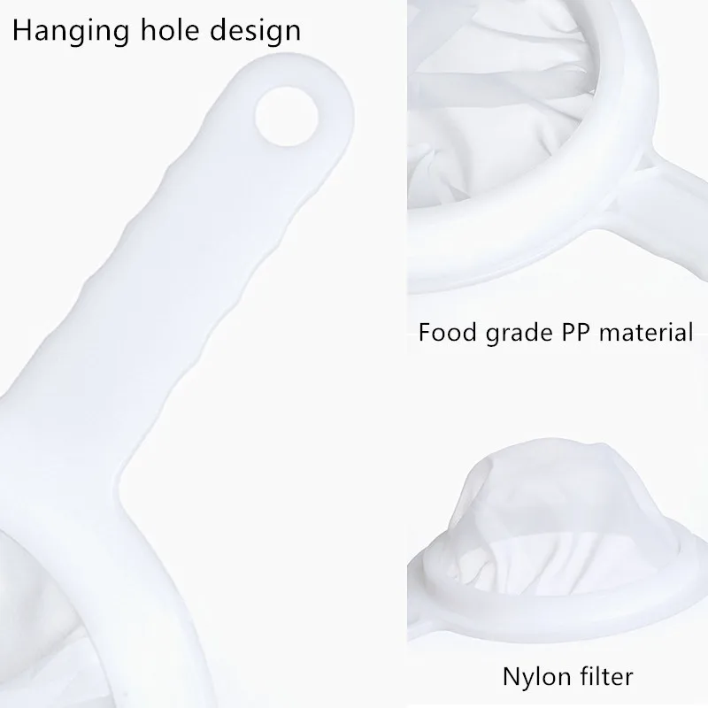 1, мелкая и ровная сетка: мелкая и ровная, сетка фильтрует, не оставляя загрязнений, экономя время ожидания. 2. Устойчивость к высоким температурам: Пищевые полипропиленовые и нейлоновые материалы могут непосредственно контактировать с пищевыми продуктами, они устойчивы к высоким температурам, легко моются. 3, нескользящая ручка: с нескользящей ручкой, она портативна в использовании. Эффективно изолирует тепло и предотвращает обжиг рук. 4, отверстие для подвешивания: ситечко имеет конструкцию отверстия для подвешивания для удобного хранения. 5, широкое применение: подходит для соевого молока, вина, кофе, молока, йогурта, сока, меда, жареной пищи.Спецификация: