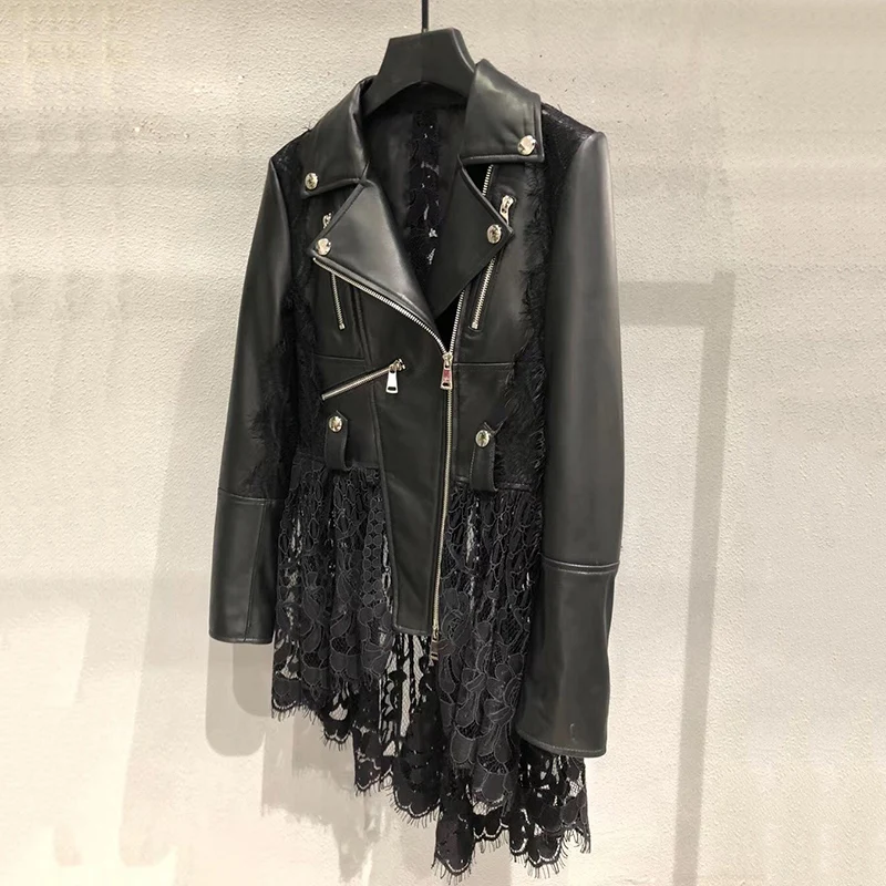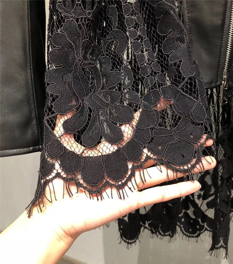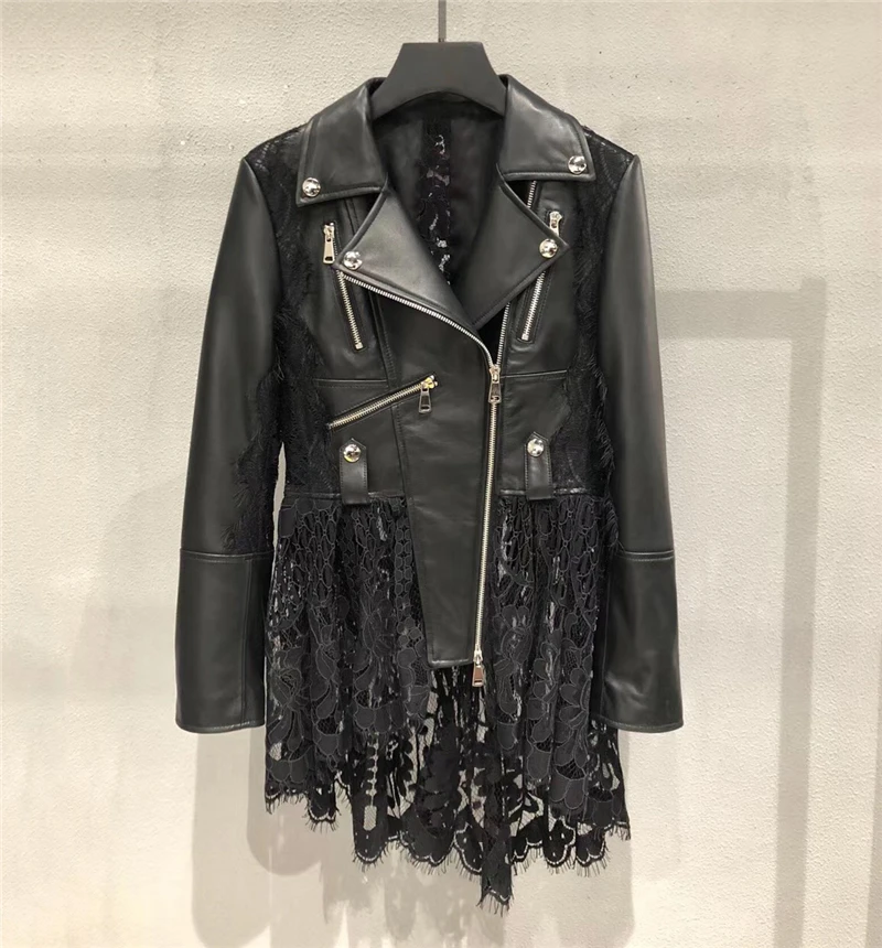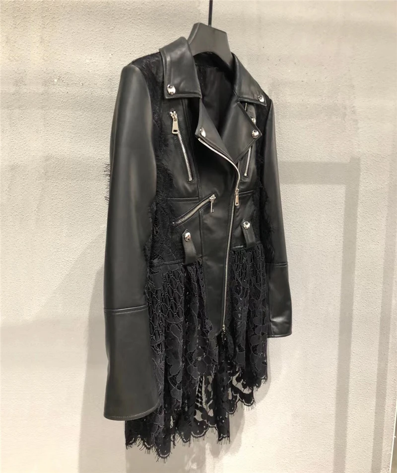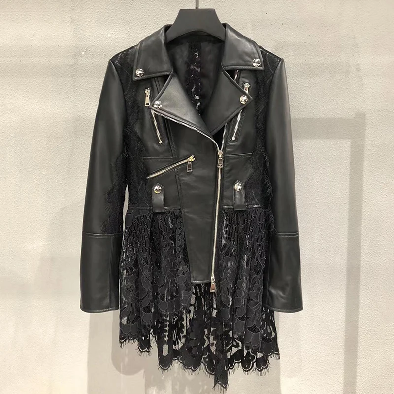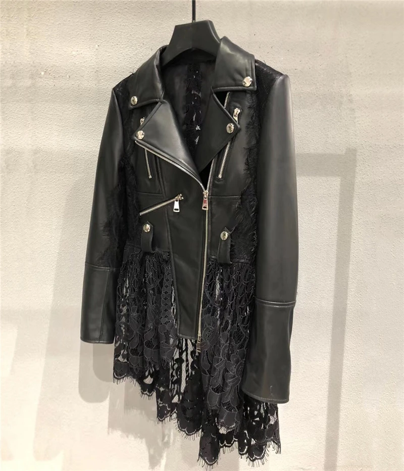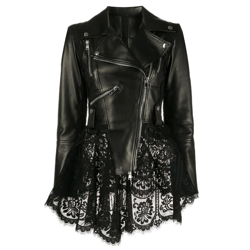 Новая весенняя Женская приталенная куртка из натуральной кожи с кружевным подолом, пальто из 100% натуральной кожи на молнии в стиле локомотива