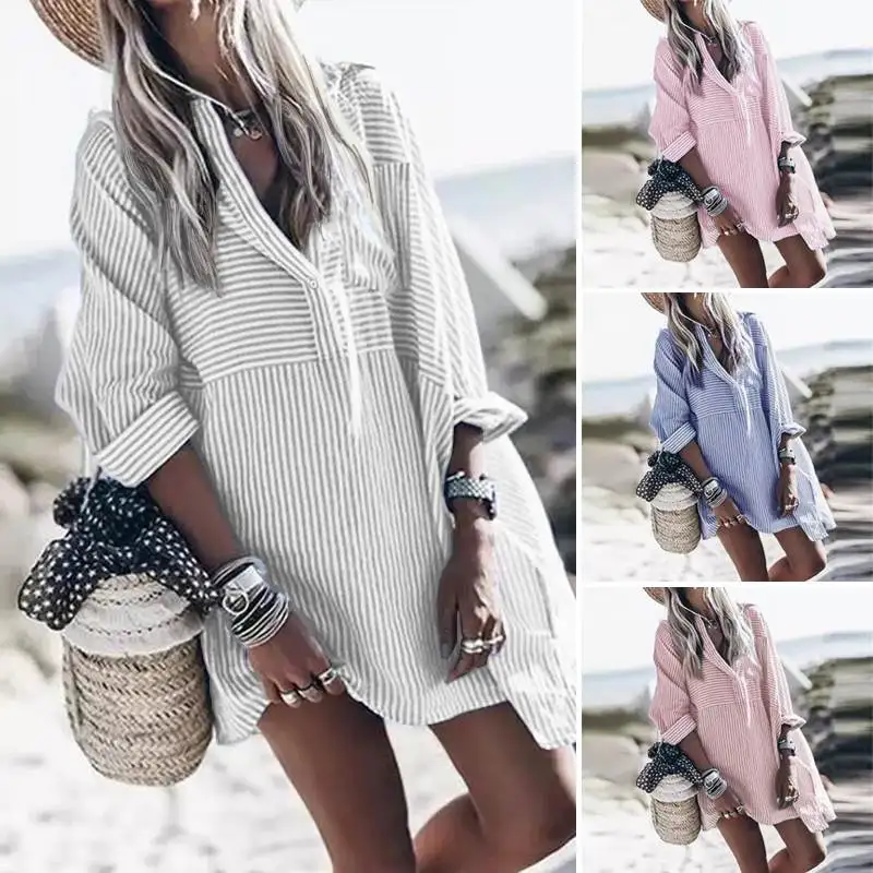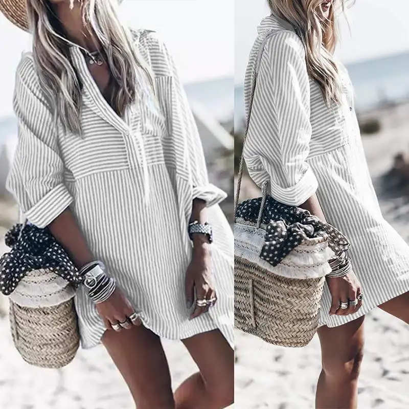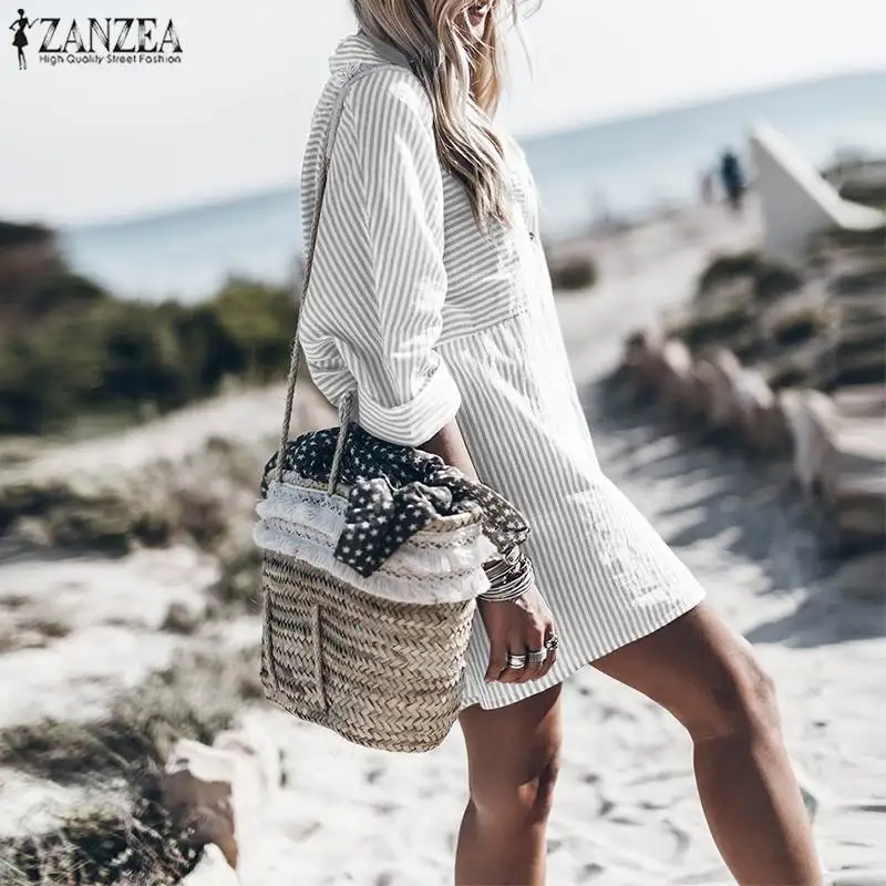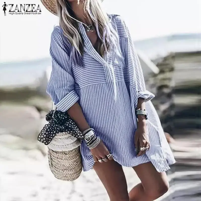 Женский сарафан-рубашка, Летнее мини-платье в полоску, повседневное короткое платье на пуговицах с длинным рукавом, большого размера, ZANZEA 2021