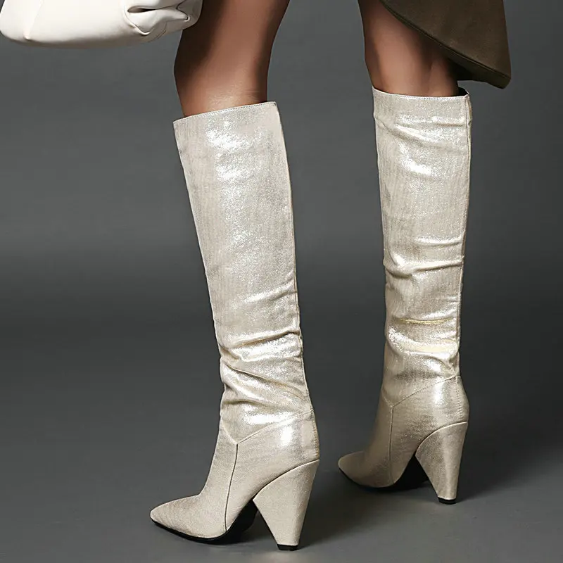 Женские тканевые ковбойские сапоги с блестками, модные сапоги до колена с острым носком, на высоком каблуке-шпильке, плиссированные зимние сапоги, новинка 2020