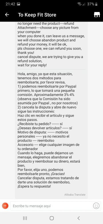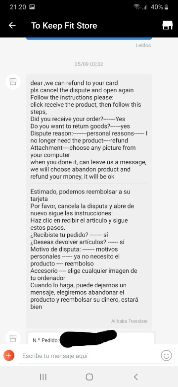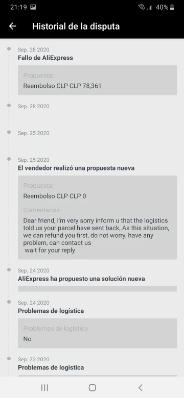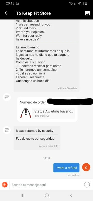 Для тех, кто из Америки, он продавец, я открывал спор, вы видите фотографии, Он потратил на меня 15 дней, отправил посылку и логистику обратно к нему, он хотел, чтобы я rembolsar 0 песо, он сказал мне, чтобы отменить спор и отметить, что я получил посылку. (Глаз купил у другого продавца тот же товар, и в сообщении попросили меня получить еще 18 долларов, чтобы он отправил, я надеюсь, что они не упадут).