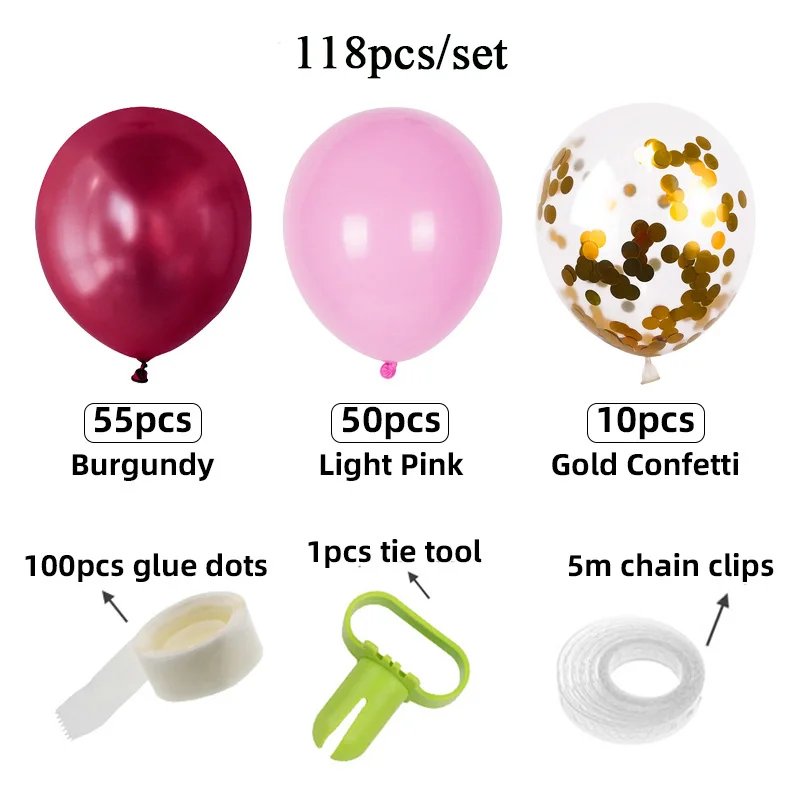 Материал: латексПосылка включает в себя:55 шт 12 дюймов бордовый латексный шар50 шт. 12 дюймов светильник розовый латексных воздушных шаров10 шт Золотой латексный шар конфетти1 рулон 5 м пластиковая цепочка для воздушных шаров1 рулон 10 шт клеевых точек1 шт. инструмент для завязывания шаров