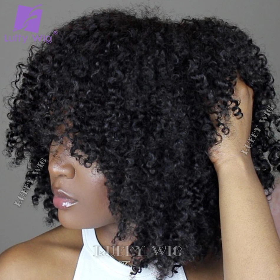 Парик Luffywig из кудрявых человеческих волос с челкой, парик на основе головы, полностью изготовленный в машине, с челкой, парики без повреждений из бразильских волос для женщин