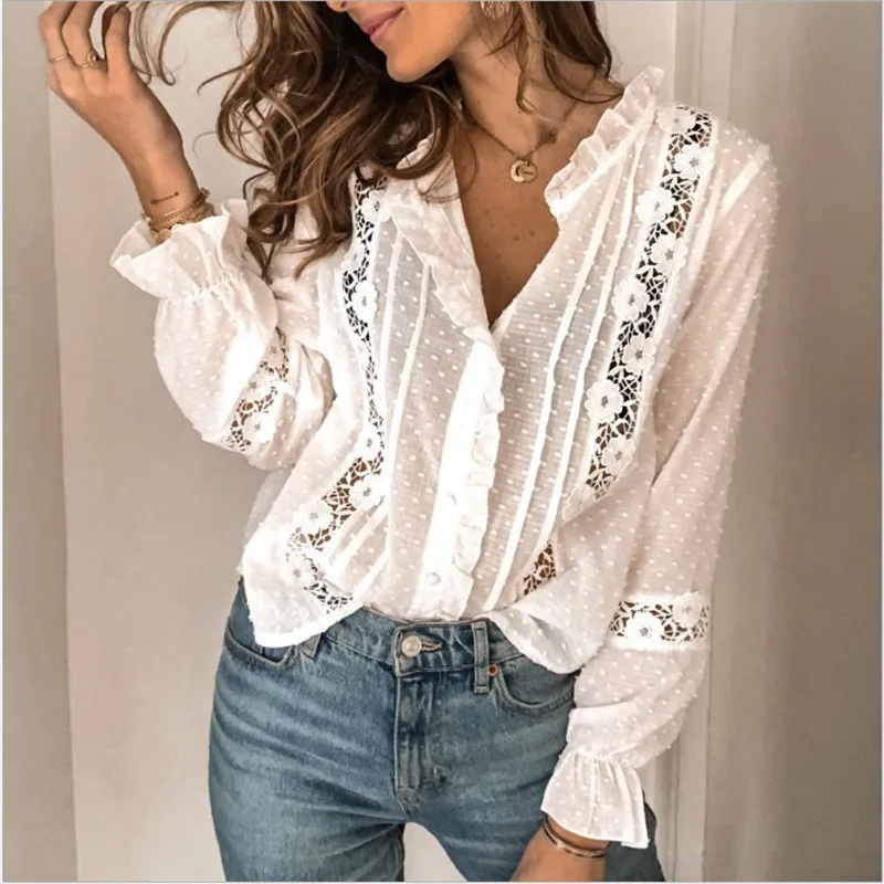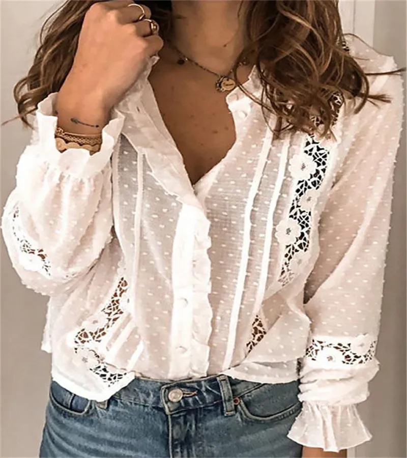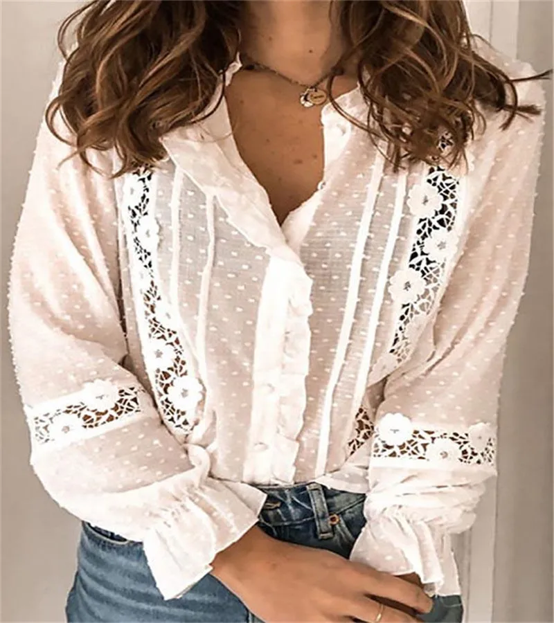Женские Элегантные блузки с рюшами, открытые вязанные крючком Цветочные Топы в горошек с рукавами-фонариками