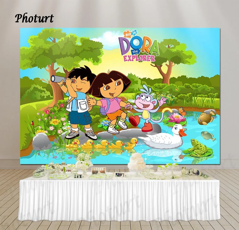 PHOTURT Доры исследователя для детской фотосъемки День рождения фон для фотосъемки с изображением зеленого леса мультяшной обезьяной, уткой фото плакат реквизиты-украшения