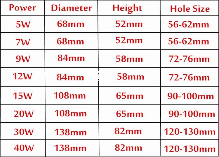 Мощность: 5 Вт 7 Вт 9 Вт 12 Вт 15 Вт 20 Вт 30 Вт 40 Вт