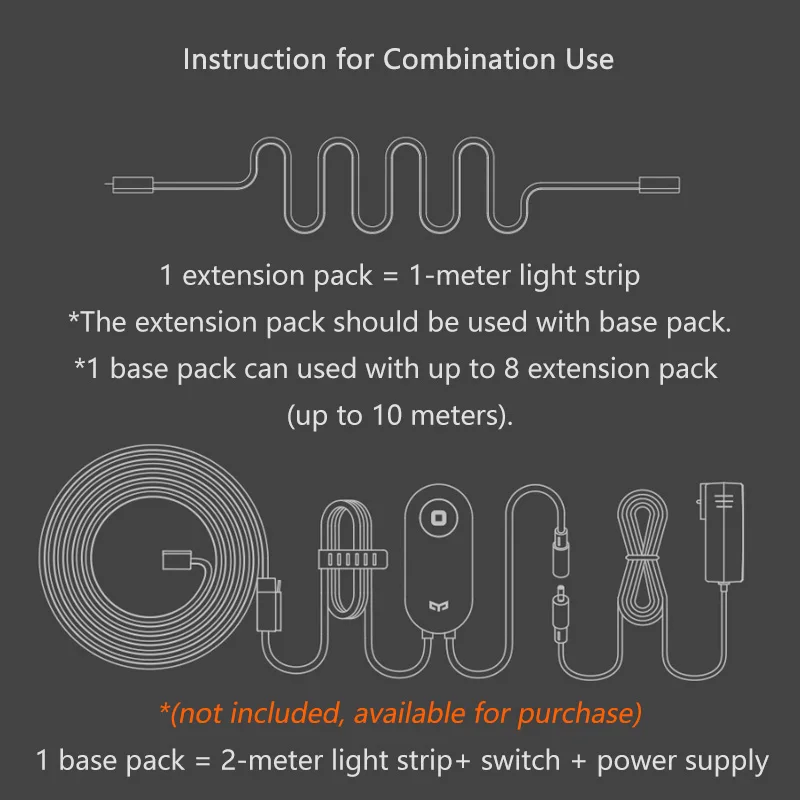 Удлинитель длиной один метр, в посылка вке нет источника питания и переключателя, его нельзя использовать отдельно. Необходимо использовать с базовой упаковкой. 1 базовая упаковка может использоваться с 8 расширениями (до 10 метров). Базовый Пакет можно приобрести отдельно.