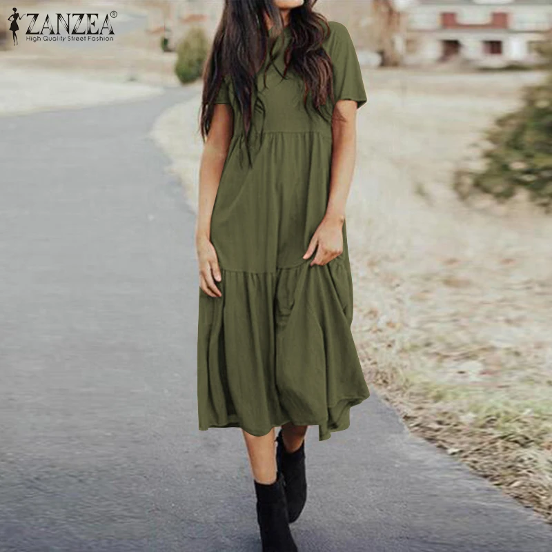 Модель 2021 года, модное платье ZANZEA с оборками, женский летний сарафан, повседневный женский сарафан средней длины с коротким рукавом и круглым вырезом, оверсайз