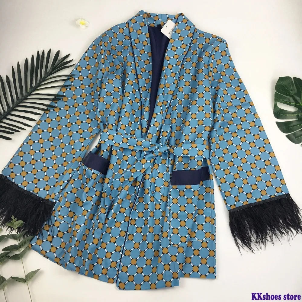 Пиджак-кимоно Женский с рукавами с перьями, Свободные повседневные брюки с широкими штанинами, винтажная одежда, костюм, синий цвет, 2020