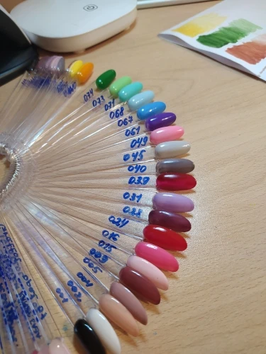 брала 4 набора по 6 шт.. цвета совпадают с фото, но некоторые оттенки, особенно розовые, прям плохой пигмент..на типсу в 2 толстых слоя, а на натуральный в 3.. из 24 цветов 4 были такими
