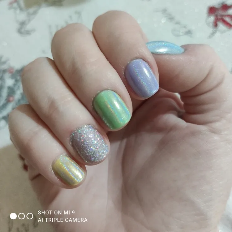 Delivered 3 days later than the window estimate but did ship out immediately unlike other items I am still waiting to be shipped. The silver and purple have holographic pieces while the glitter in the rest of the colours is only one tone. Still nice for the price. Polish swatches look better in person than the photo but I tried! I’m wearing two swatches of the purple.