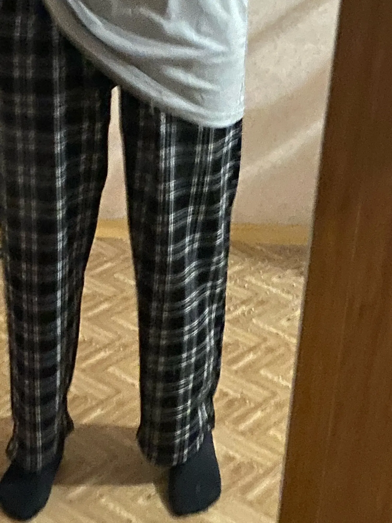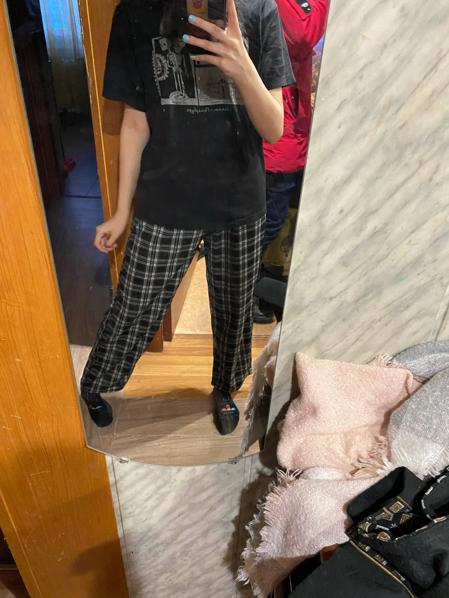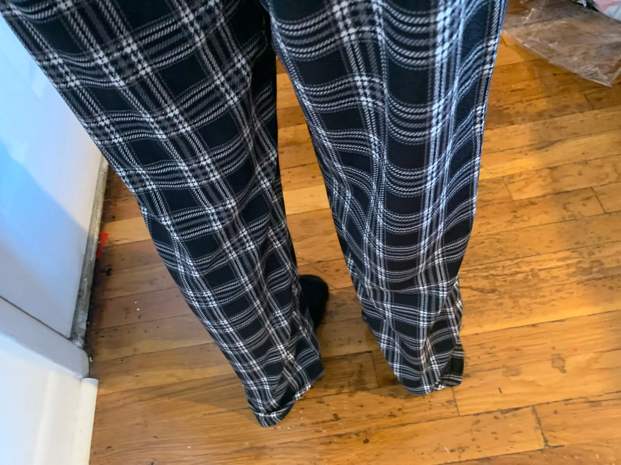 На рост 174 короткие, было ожидаемо, но не думала, что настолько) можно, конечно, их опустить ниже талии, но вида уже никакого не будет. Материал тонкий, по внутреннему шву собирается какая-то гармошка, на фото видно. Пришли быстро, недели за 2.