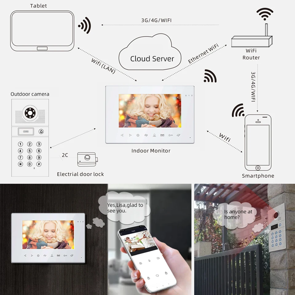 ♦Поддержка смартфона iOS и Android с помощью приложения Tuya smart.♦Цифровая система, 4 провода кабельного подключения.♦2-полосная связи между внутреннего и наружного блока. Поддержка 2 способ связи между мониторами.♦1.3MP камера, широкий угол обзора.♦Когда кто-то звонит на улице, ваш монитор и смартфон будут звонить одновременно.♦Голосовое сообщение и обнаружение движения, поддерживаемая домашняя система сигнализации, может добавить 8 зон безопасности сигнализации (например: датчик дыма, газовый датчик, датчик PIR... и т. Д.)♦WIFI включен или проводной маршрутизатор.