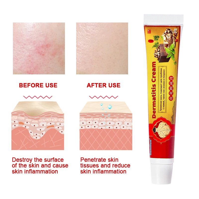 Название:Мазь для ухода за кожейПрименение:КорпусВес нетто:20 гУпаковка:3 шт Антибактериальный кремПодходящая кожа:Общее назначениеХранение товара:Герметичный, помещается в прохладное сухое место.Срок годности:2 годаРазличные типы проблем с кожей1. Экзема (атопический дерматит) является одним из серьезных заболеваний кожи, которые включают в себя группу медицинских условий, которые вызывают воспаления и раздражения кожи. Проблема в основном возникает до 5 лет, но может возникнуть в любом возрасте. Распространенными признаками являются покраснение кожи, сухая чешуйчатая кожа, блистерное образование и т. Д.2. Псориаз-это еще одно тяжелое расстройство кожи, которое приводит к образованию красных цветных бляшек, покрытых серебряными чешуйками. Красные пятна на пораженной области и утолщенные, ребристые ногти являются распространенными признаками.3. Солнечные ожоги, акне, прыщи и волдыри являются обычными повседневными проблемами кожи. Акне-почти жалоба большинства взрослых, особенно в подростковом возрасте.Мазь для лечения проблем с кожейВведение:Мазь для ухода за кожей-это продукт, который специально снимает и лечит экзему, подавляя бактерии и встраивание, предотвращая экссудацию и устраняя воспаление.Основные ингредиенты:Чистые травяные экстракты, такие как Sophora flavescens, Daqingye, Kochia scocaria, белый Соболь, flavescens, семена змеиной кровати, Bai Bu, camphor, wintergreen oil и т. Д.Применимо:Подходит для кожных воздействий, опрелостей, молочной сыпи, укусов комаров, аллергии на кожу, пота и экземы, зудящей кожи и так далее.Как использовать:1. Для внешнего использования2. После очистки кожи нанесите соответствующее количество этого продукта и помассируйте на некоторое время, чтобы помочь ему проникнуть.3. Три раза в день.Этот крем доступен для детей и взрослых.Внимание:1. Только для внешнего использования.2. Избегайте контакта с глазами.3. Пожалуйста, храните его в тени и держите в недоступном для детей месте.