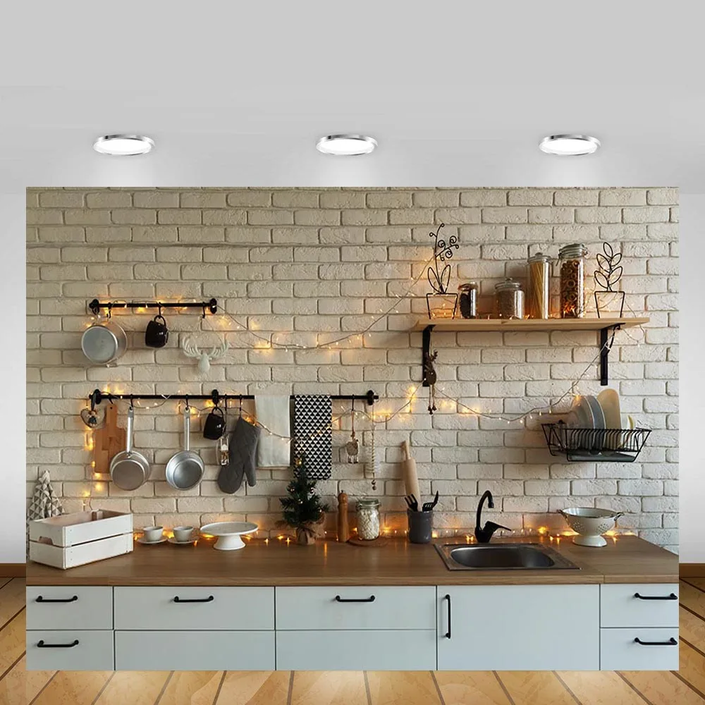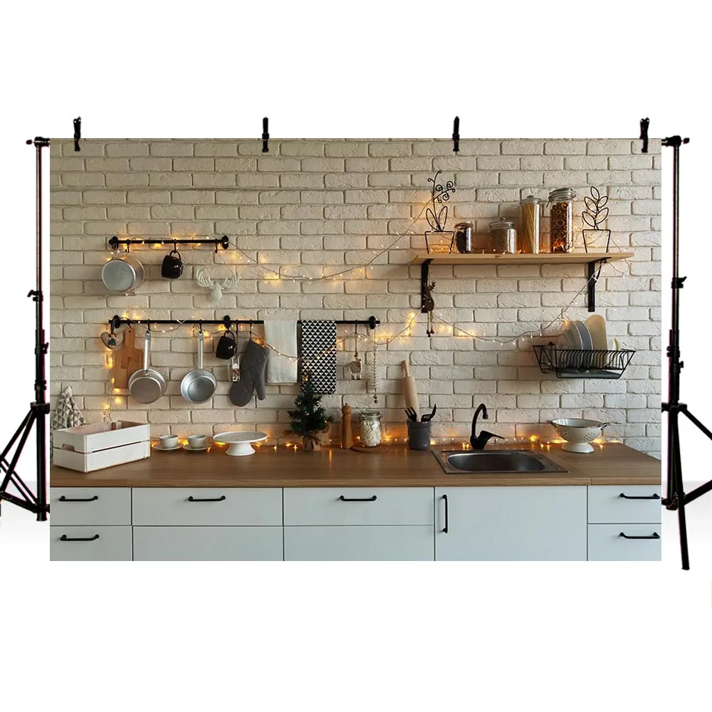 Рождественский кухонный фон Mehofond, белый шкаф, кирпичная стена, блестящие светильник ны для фотографий, реквизит для фотостудии