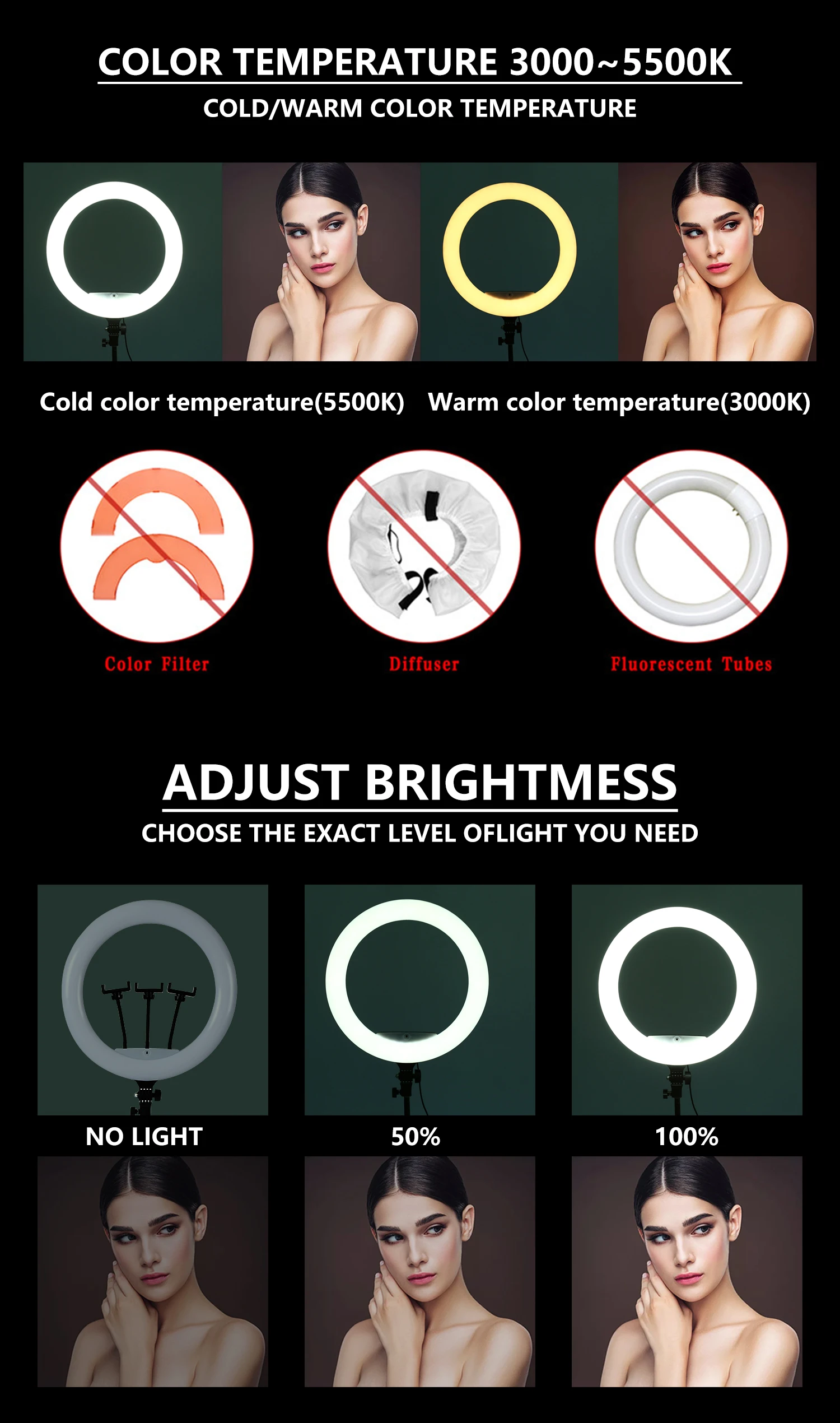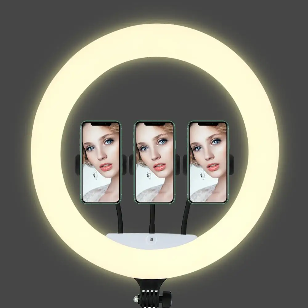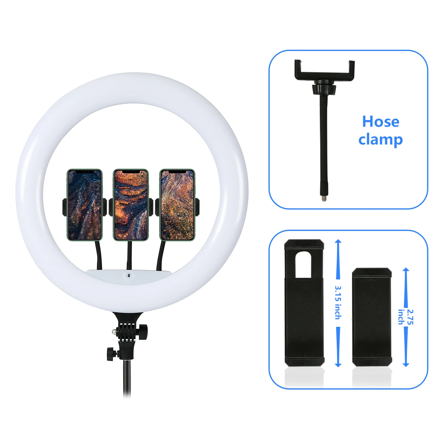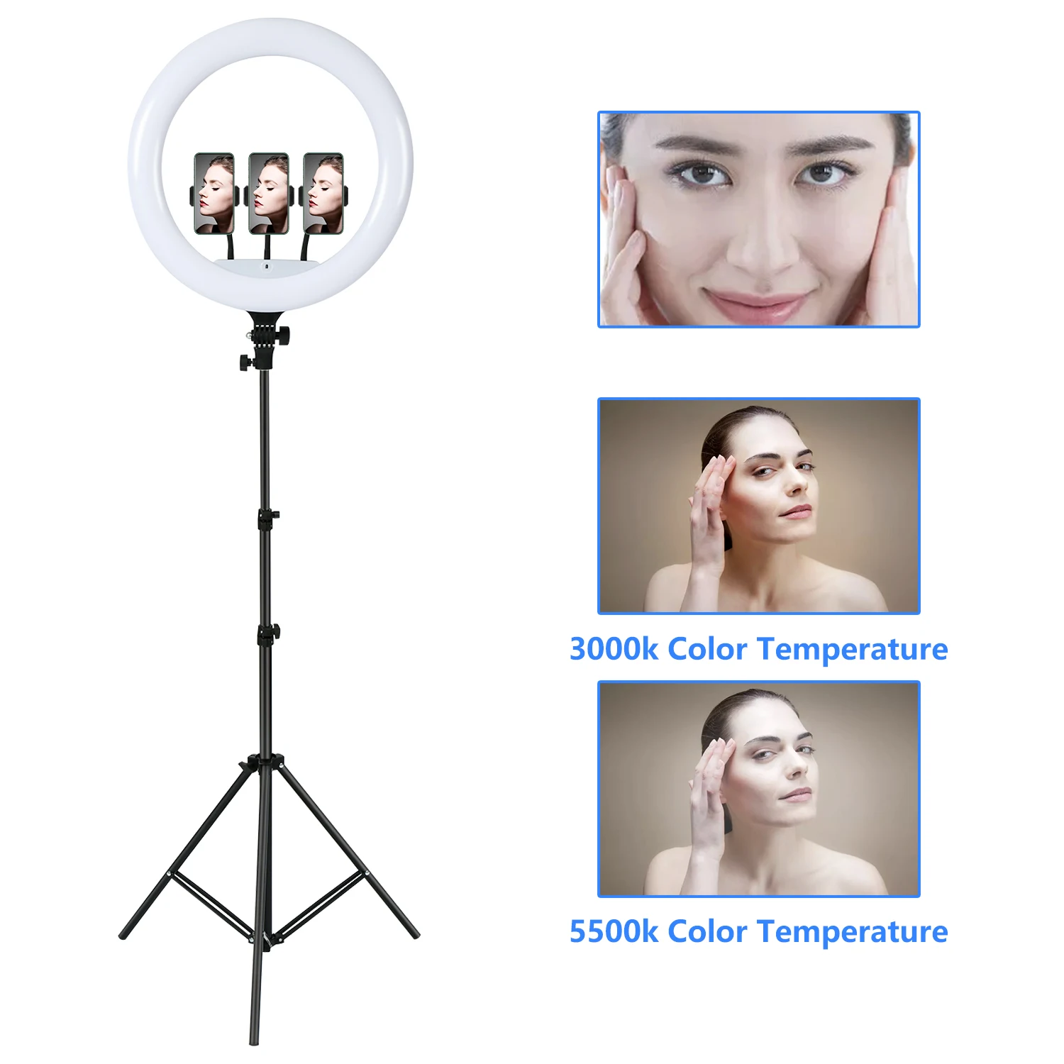 Кольцевой светильник для селфи, 18 дюймов, светодиодный подставкой, светодиодная кольцевая лампа для видеозаписи, видеоблогов, кольцевая лампа с 3 держателями для телефона, разъем питания