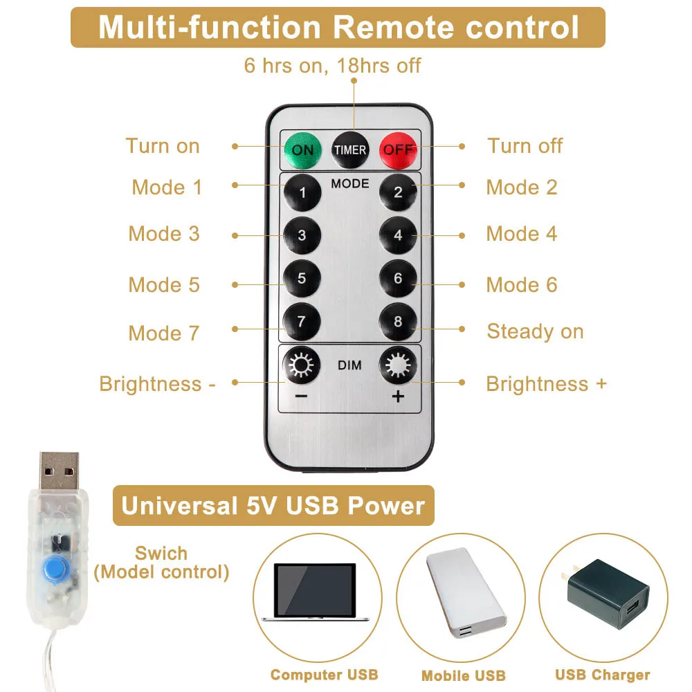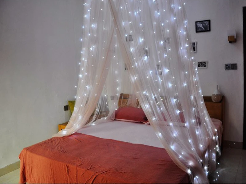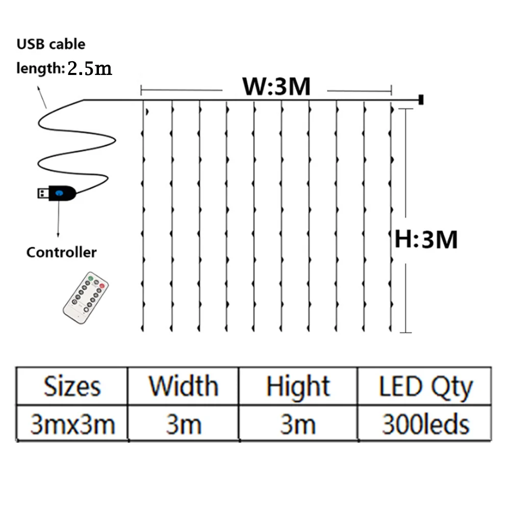 Характеристики: Размеры: 3x3m Светодиодный Кол-во: 300 светодиодный s Цвета: теплый белый/многоцветный/синий Материал: пластик + медная проволока Водонепроницаемость: Да Питание от: USB Режим: 7 вспышек + постоянное включение Режим управления: пульт дистанционного управления + кнопка подключения USB С пультом дистанционного управления: Да Преимущества продукта: Регулируемая яркость/режим управления проще