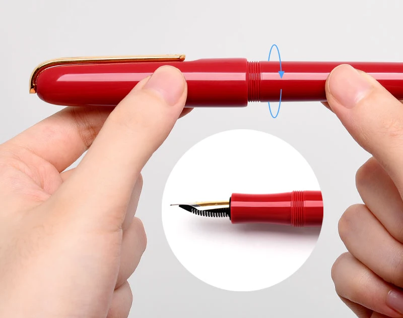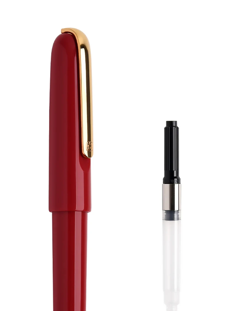 Отличный дизайн, длиннее, чем кажется на фото (135 мм). Перо F, но написание EF (на помеченной бумаге). Широкая и удобная секция. Очень сбалансированный вес с капюшоном и без него. Красный акриловый Смола показывает блестящую и очень хорошо обработанную полировку.