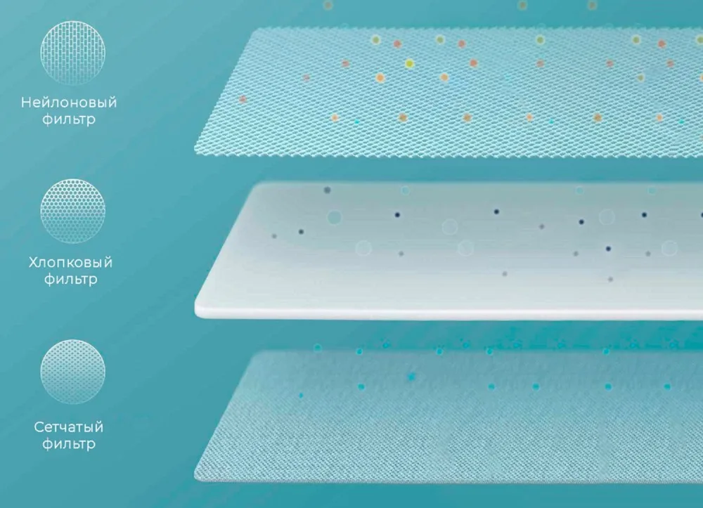Третий слой: HEPA-фильтр эффективно фильтрует грязь размером 3 микрона.