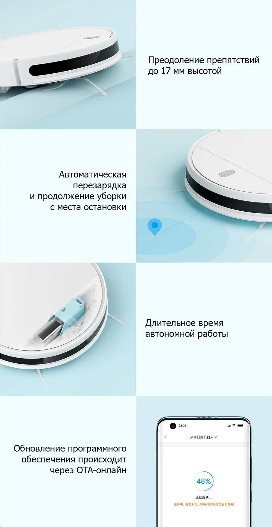 Xiaomi MIJIA Sweeping Robot G1 оснащен тройной системой тонкой фильтрации выходящего воздуха, которая может фильтровать пыль и грязь размером до 3 микронов, чтобы избежать вторичного загрязнения.