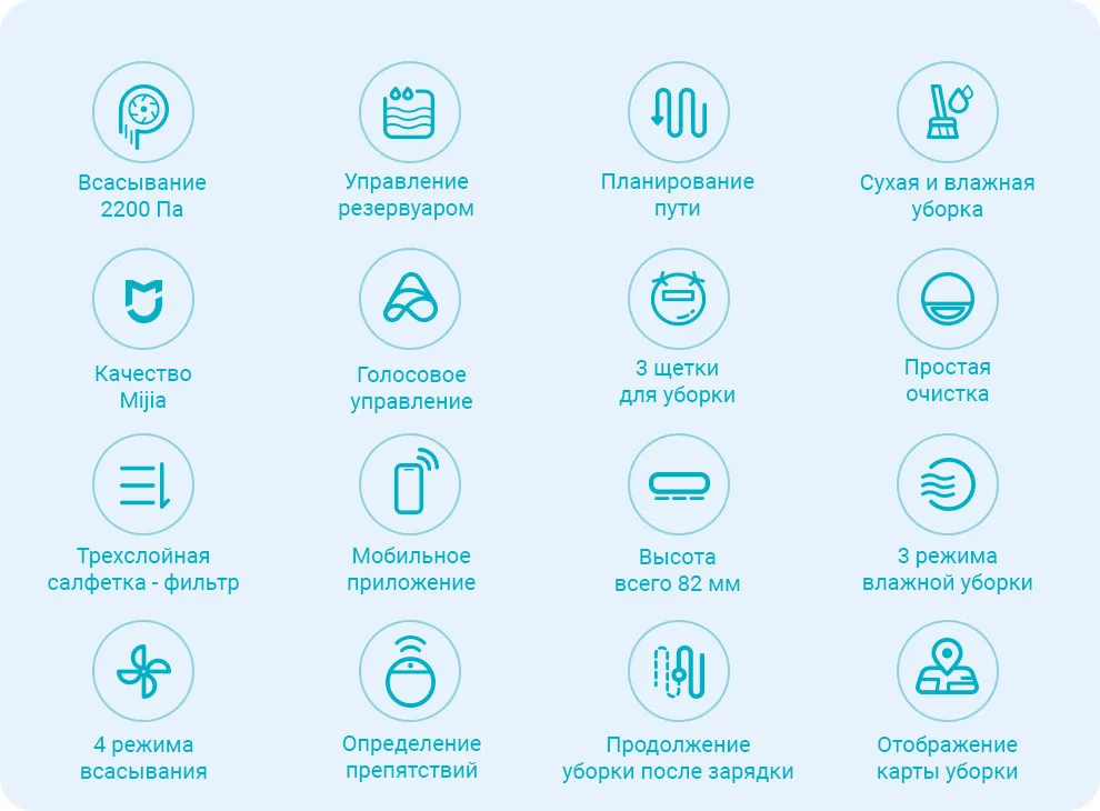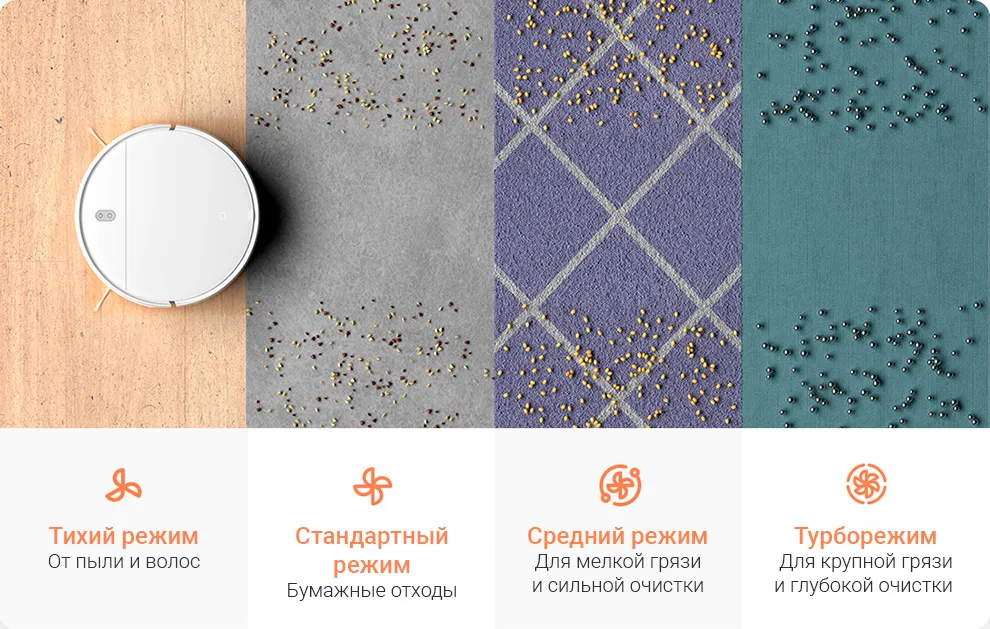Робот пылесос Xiaomi MIJIA Sweeping Robot G1 сам распознает необходимую мощность всасывания. Минимальная мощность для уборки легкой пыли с гладких покрытий. Средняя мощность для уборки просыпанных продуктов. Увеличенная мощность для уборки ковровых покрытий и тяжелого мусора. Максимальная мощность для уборки ковров.