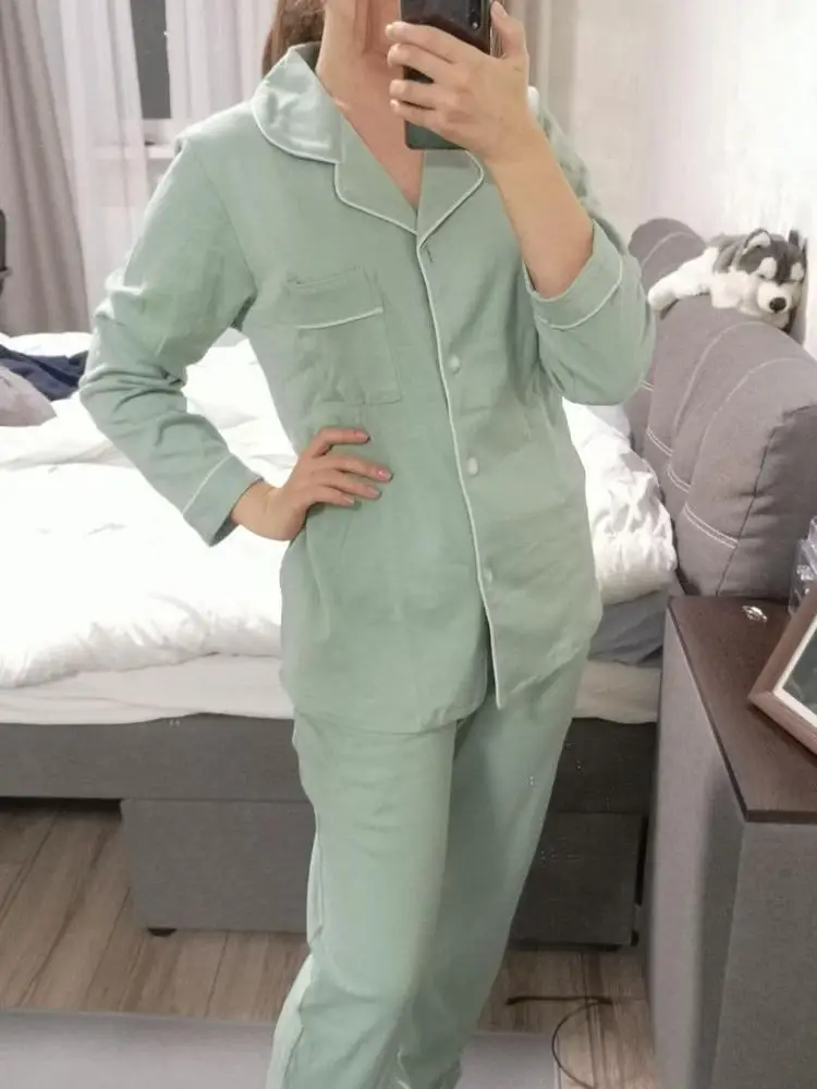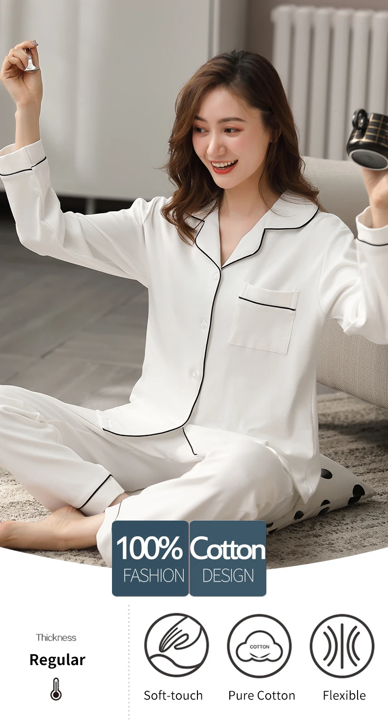 Зимняя пижама из 100% хлопка для женщин, осенняя однотонная белая пижама с длинным рукавом, женская пижама из чистого хлопка, розовая пижама