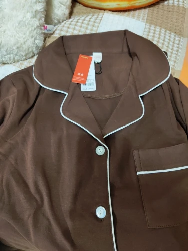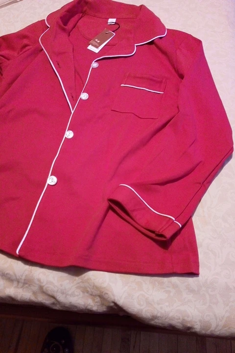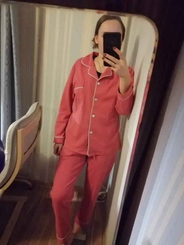 Пижама супер 100 % хлопок. Ткань не рыхлая. Трикотаж. Все швы ровные, вставлен Кант, очень аккуратно. Много красивых мелких деталей: манжеты с кантом, Английский ворот из 2-х деталей. Роскошная качественная пижама. На 50 размер хорошо xxl. Я взяла на 48 - xxl, немного свободновато, но для пижамы тоже отлично.