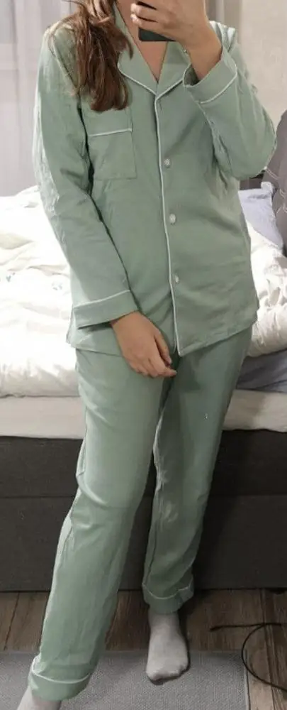 Хорошее качество пижамы. Ткань приятная к телу, слегка струится, словно с примесью вискозы. Брала на размер М, обычно ношу S. Село свободно, длина рукавов как раз на рост 160см, советую брать на размер больше, чтоб не было коротким. Заказала 11.11 приехало 03.12 Новой почтой. Цвет light green думала будет светло-мятным, но в жизни он более насыщенный.