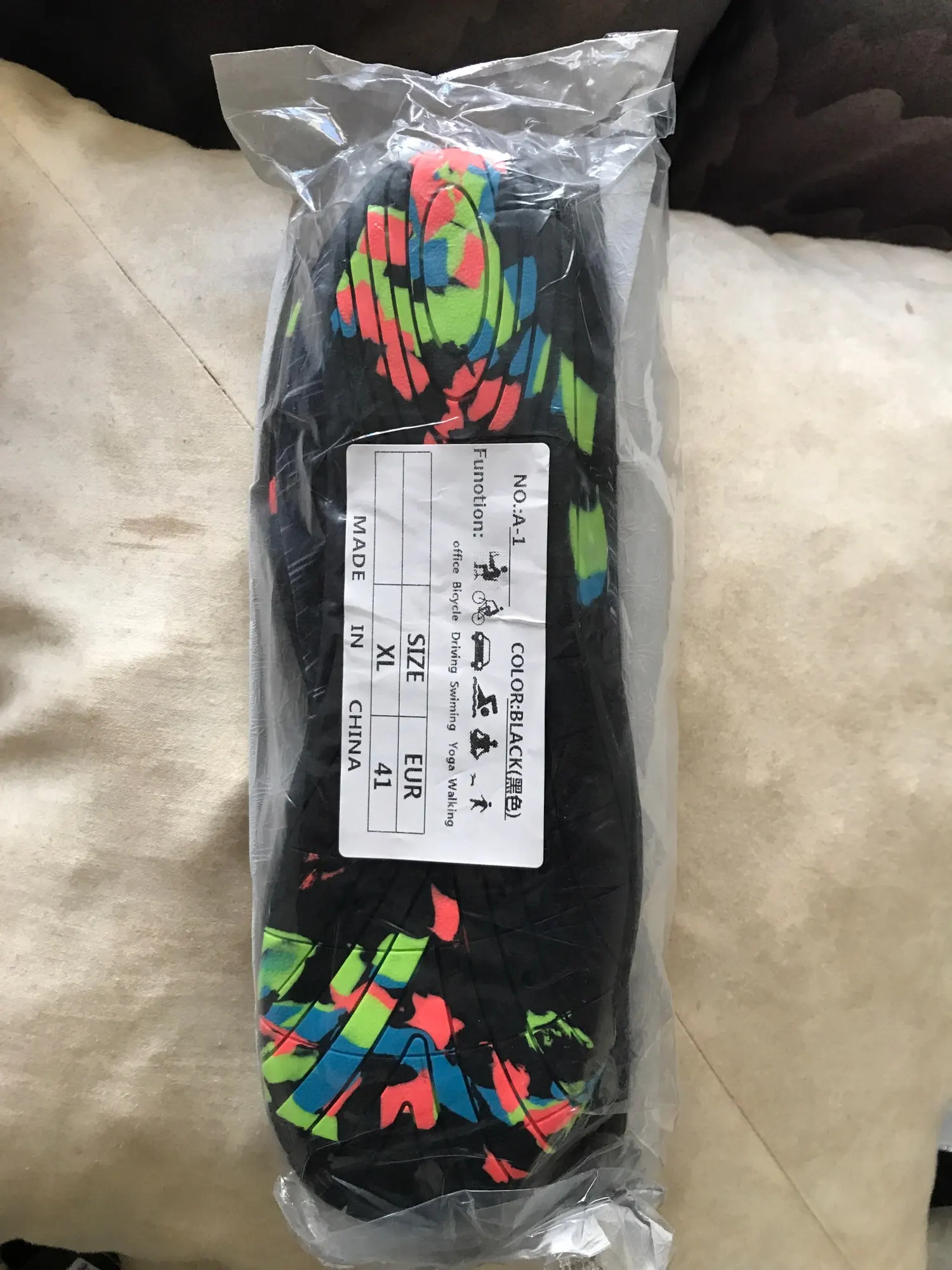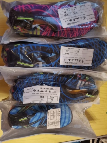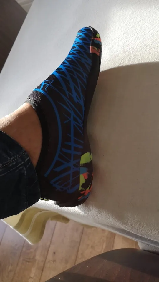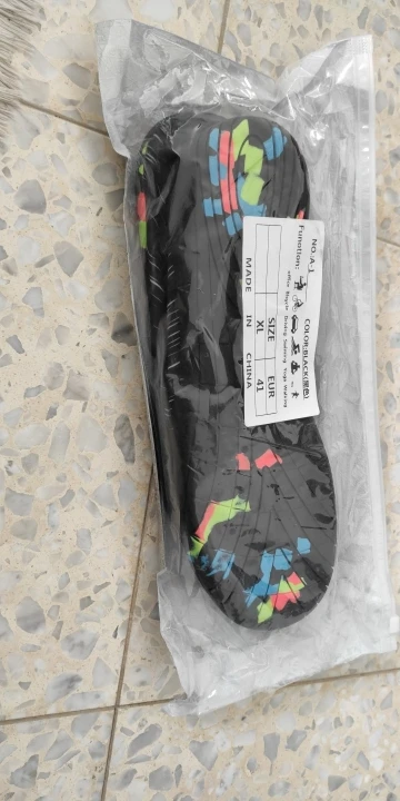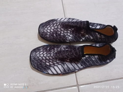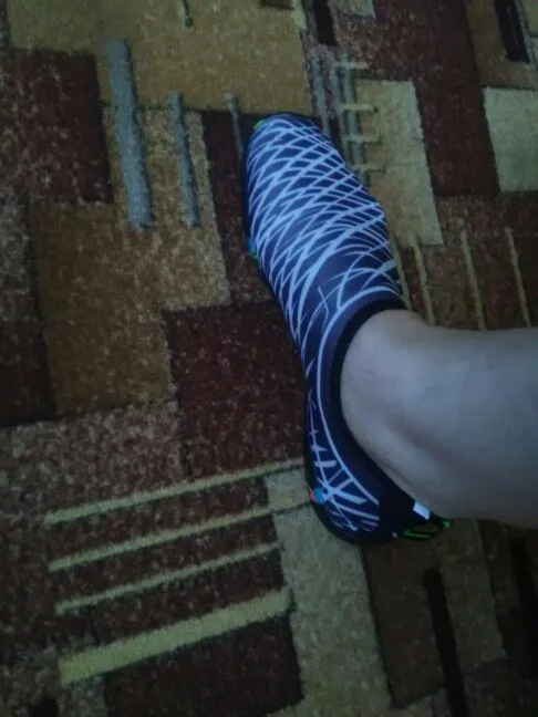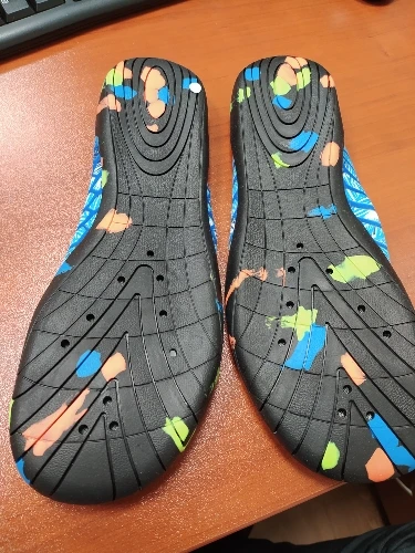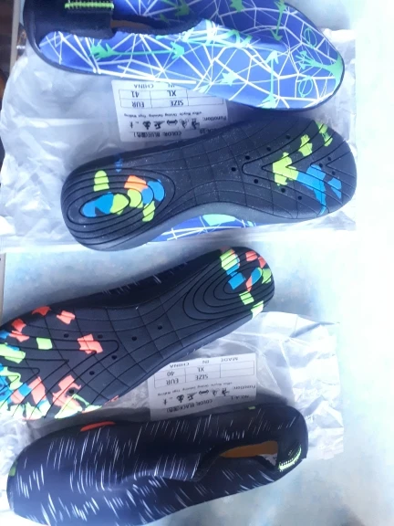 Доставка 25дней в Майкоп.На вид симпатичные.У подошвы следы клея,но не критично.Подошва плотная,но гибкая,по камням ходить будет удобно.На мою длину стопы 26см заказала26,5.Надо было заказывать размер в размер,т.к они тянутся.В воде не должны соскочить из-за плотной резинки.Рекомендую.Продавцу спасибо.