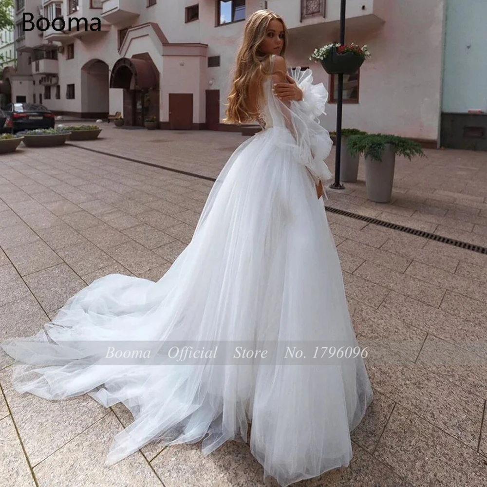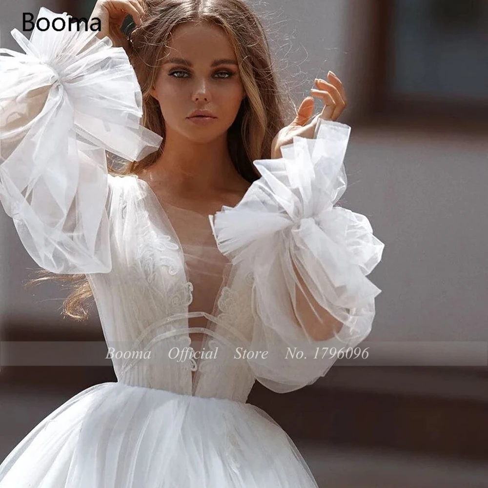 Пляжное свадебное платье с глубоким V-образным вырезом, белое длинное Плиссированное Тюлевое платье-трапеция с пышными рукавами, аппликации свадебные платья, с открытой спиной