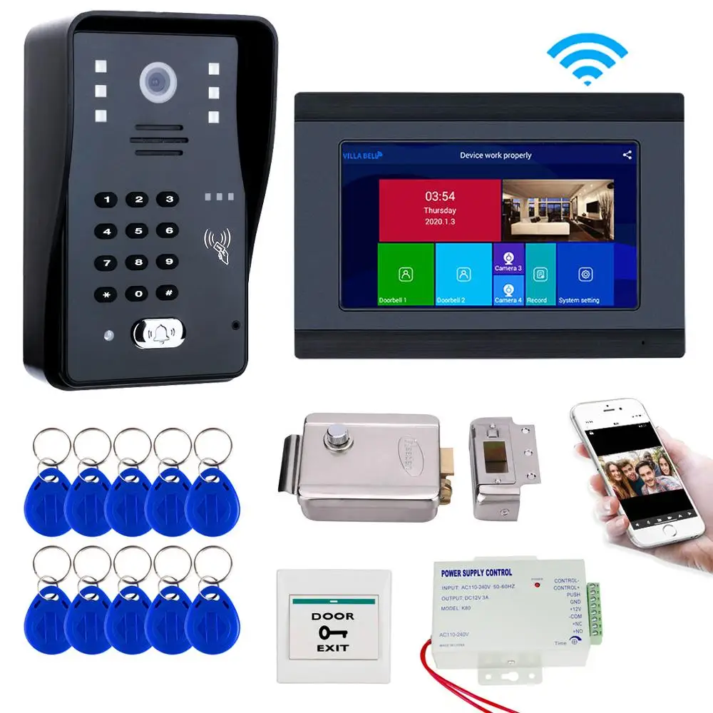 Видеодомофон 7 дюймов, Wi-Fi, комплект видеозвонка Intecom с электрическим замком, ID-брелок, мобильный телефон, домофон с приложением, разблокировка