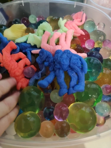 Не гель,конечно, но рвется тоже легко,когда воду наберёт)) в окончательном варианте размер удобный для детской ладошки. Без воды быстро усыхают снова. что ещё... Детям нравятся очень, уже неделю каждый день играем)