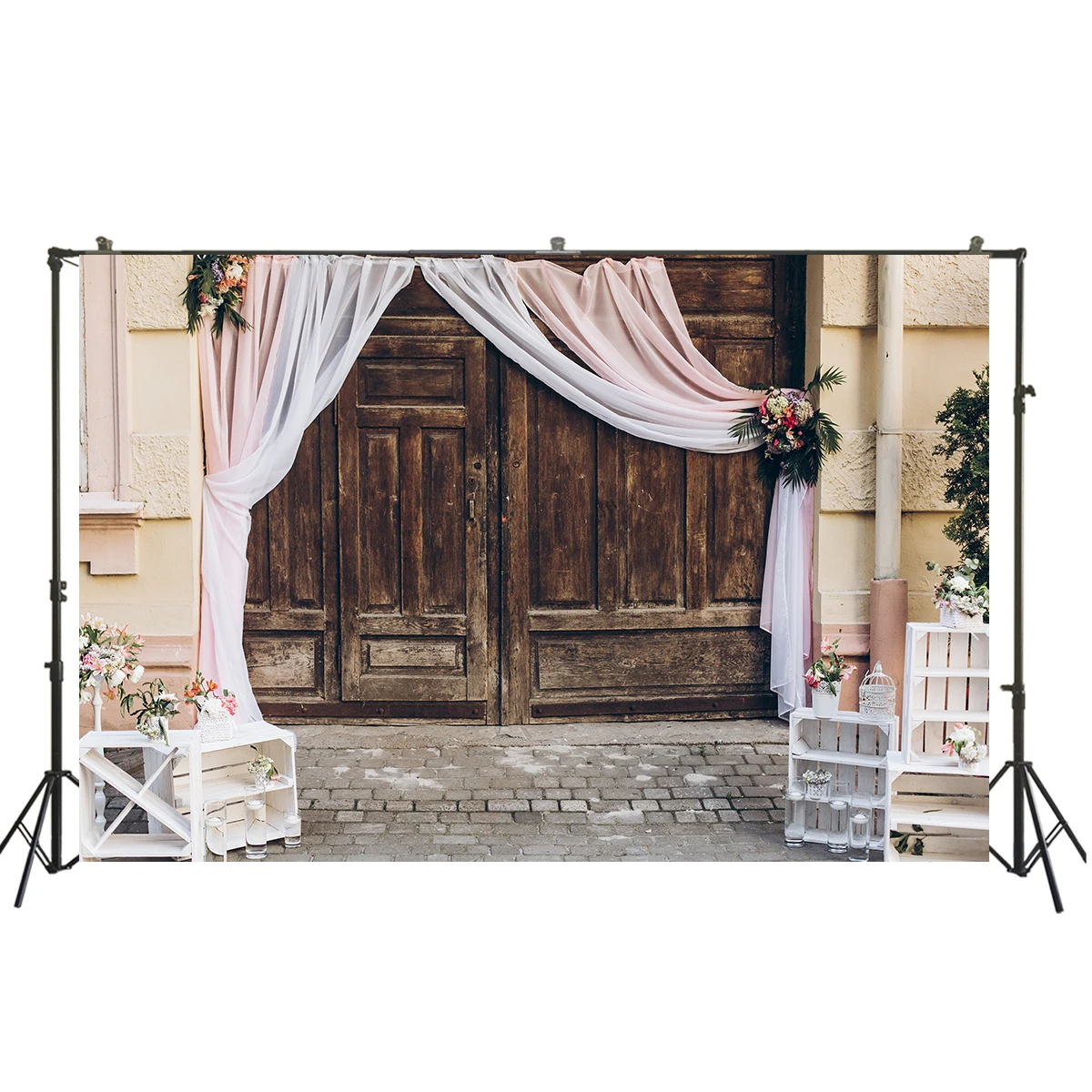 Фон для фотосъемки детей в деревенском стиле с изображением деревянных дверей занавески с цветами
