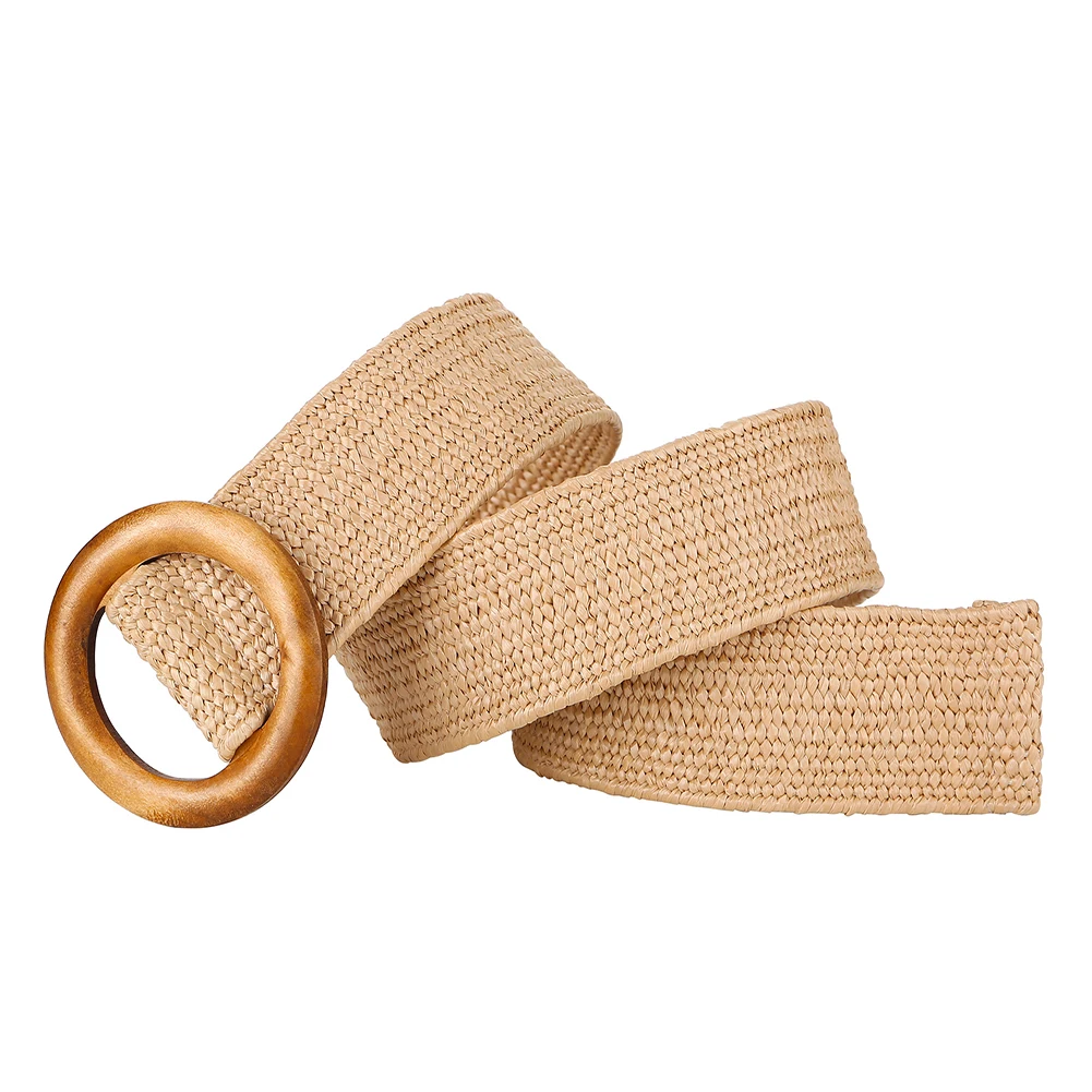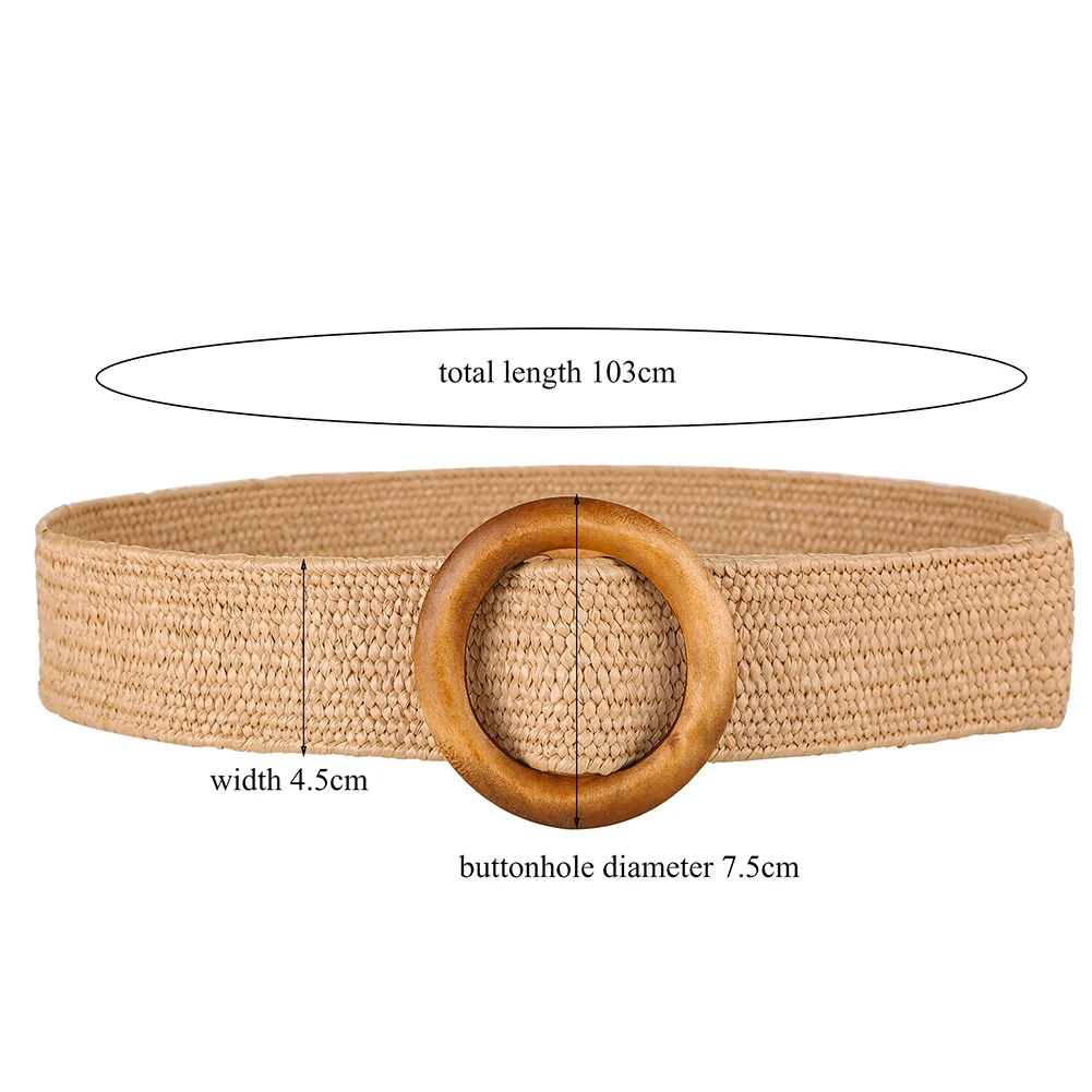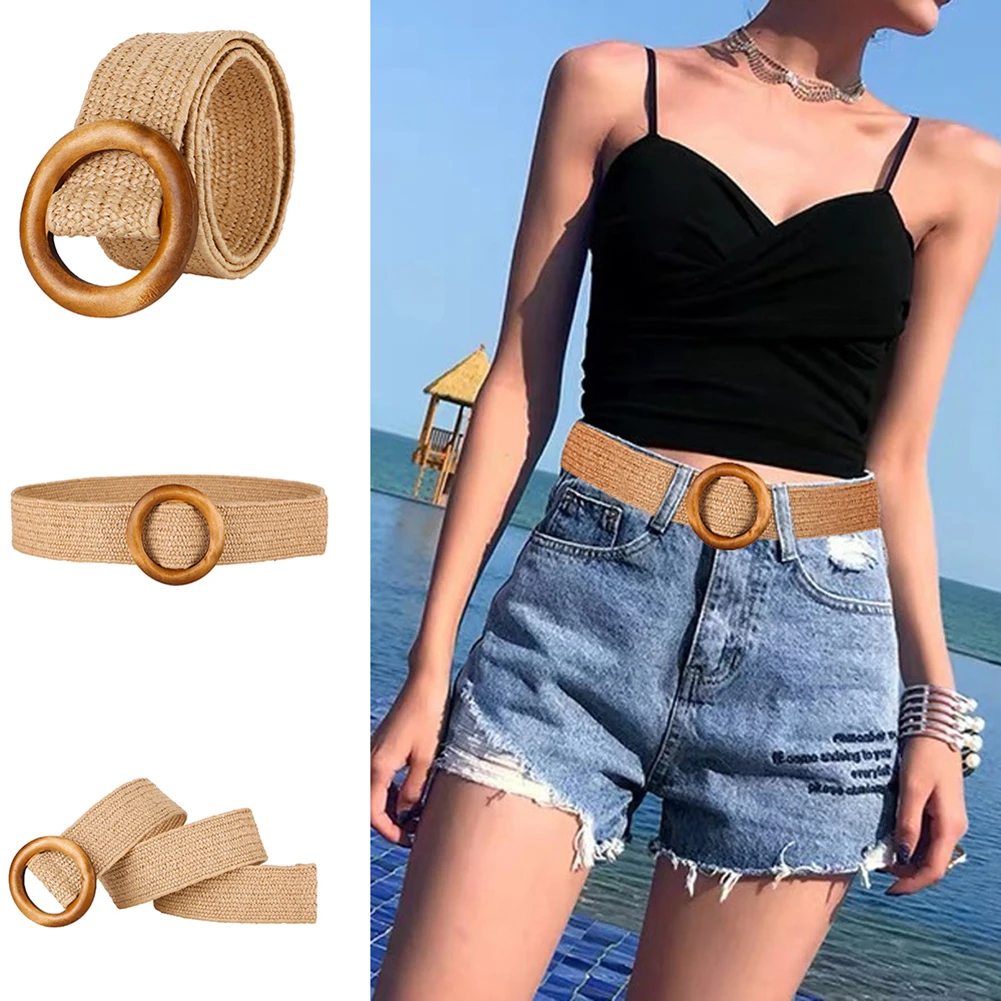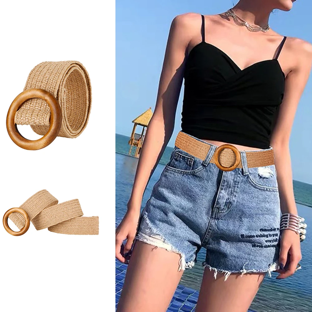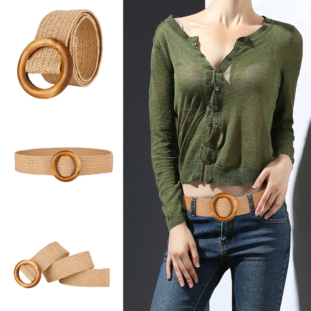 Женский Плетеный соломенный ремень с круглой деревянной пряжкой