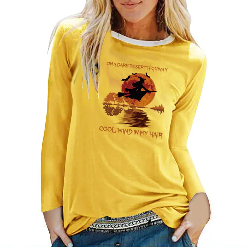 Женский топ на Хэллоуин с длинным рукавом и принтом ведьмы на темной пустыне, осенне-зимняя футболка с графическим принтом, белая одежда с круглым вырезом