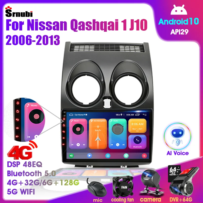 Автомагнитола 2 DIN для Nissan Qashqai 1 J10 2006-2014 с радио, навигацией, мультимедийным проигрывателем, DVD, Carplay, стереоколонками, головное устройство на Android 11