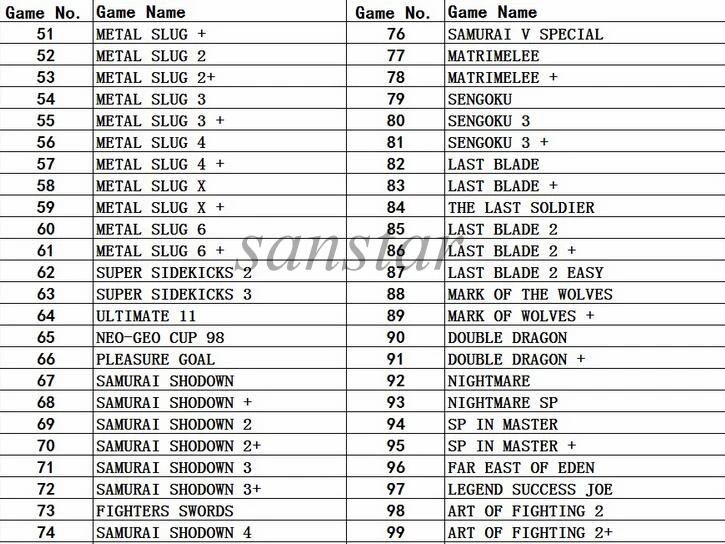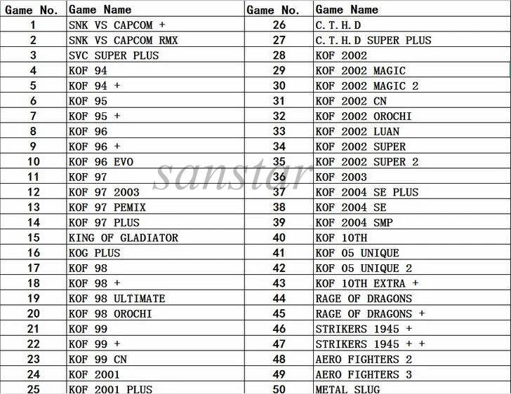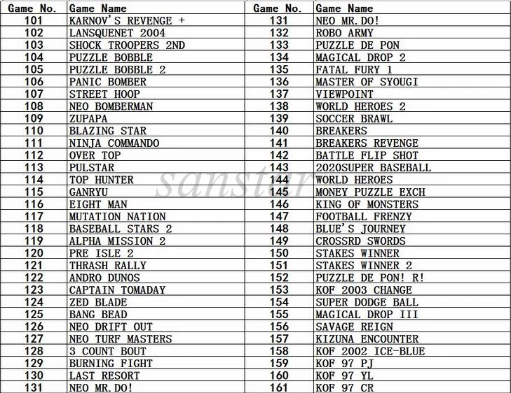 Игровой картридж SNK 161 в 1 работает с консолью SNK, кассетой snk, кассетой neo geo, тележкой snk 161 в 1, подходящей для материнской платы SNK 1 slot, содержит 161 Классические боевые игры snk. И игры следующие: