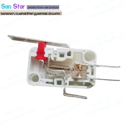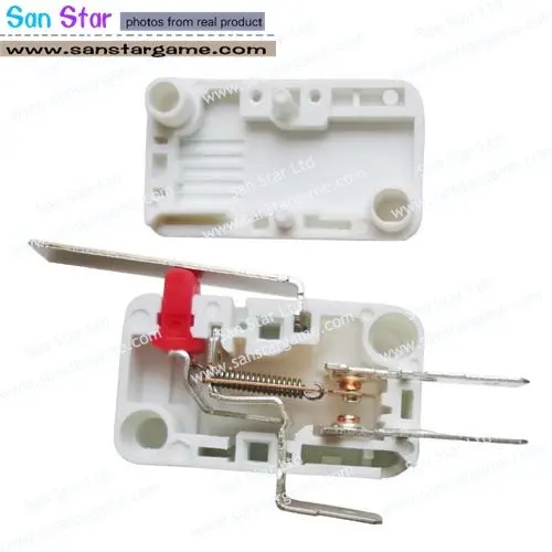 Белый микропереключатель имеет три терминала со вспомогательным приводом, он отличается гибкой емкостью переключателей и прочной пластиковой крышкой, которая подходит для большинства аркадных джойстиков.