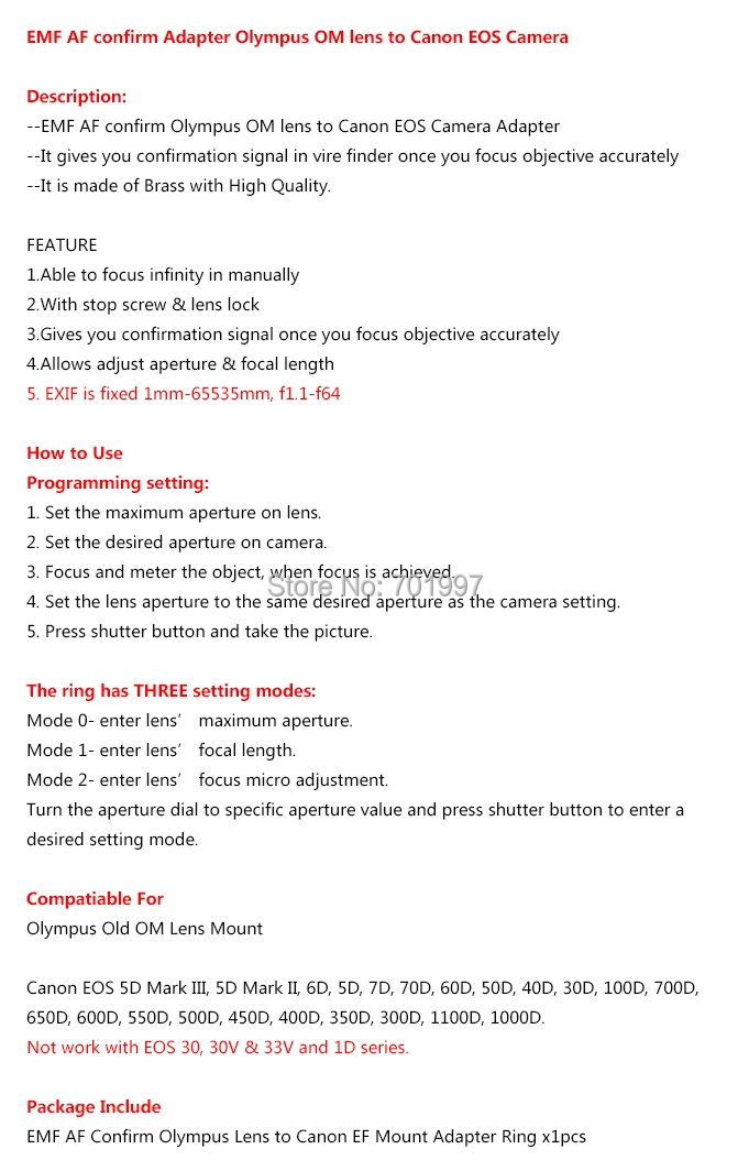 Кольцо-адаптер PIXCO EMF AF для объектива Olympus OM для камеры Canon EOS EF, серебристый латунный